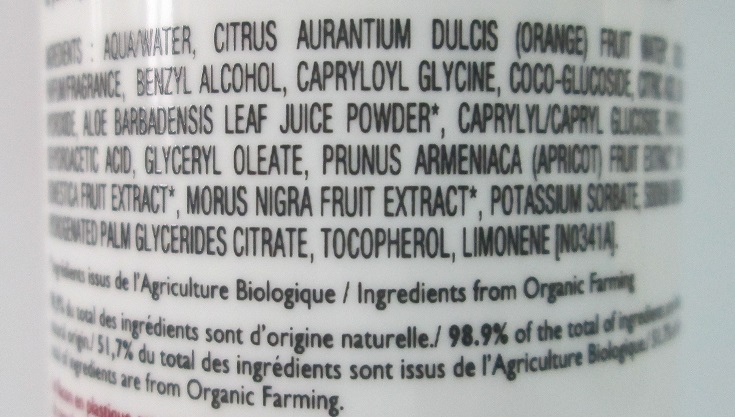 Hace poco más de un año, probé una minitalla de este mismo producto, y cómo podéis observar, ¡he repetido con él!. Su textura líquida tiene un color anaranjado, bastante curioso, y es debido a que es rico en agua de naranja, principalmente. Por ello, lo más característico de él, es su rico aroma a naranja, aunque tiene un sutil y suave toque floral y dulcecito, a la vez, que me recuerda mucho a las flores del naranjo, jejeje.