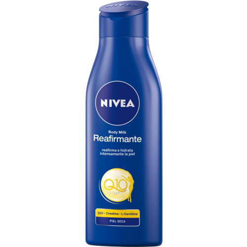 Nivea Q10 body milk reafirmante- Si aplicas esta crema después de ducharte, además de hidratar tu piel, estarás a la vez reafirmándola, por lo que podrás solucionar dos problemas con un solo producto.