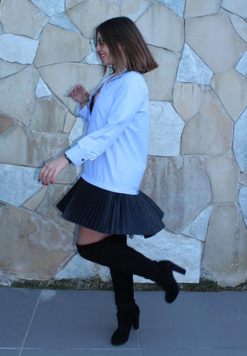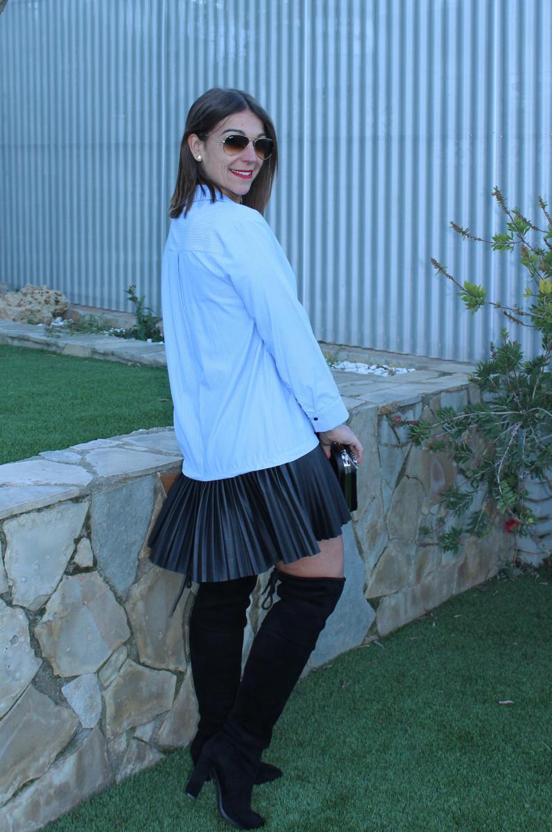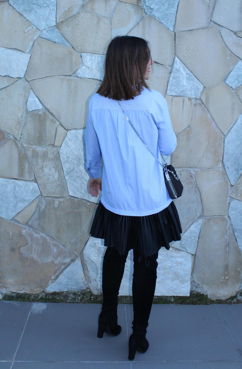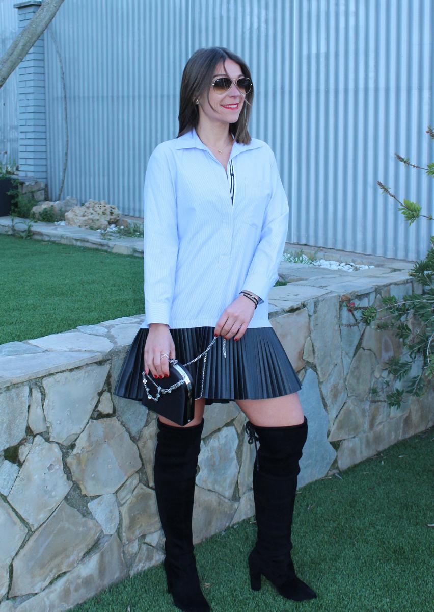 Una combinación de camisa larga de rayas en popelín, con corte por debajo de la cadera a la que después se le une una faldita plisada en polipiel, al más estilo jugadora de tenis.