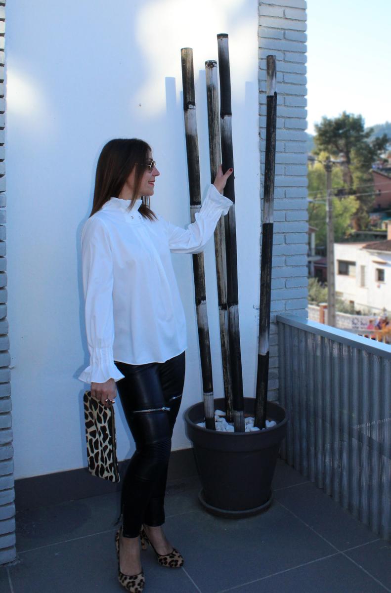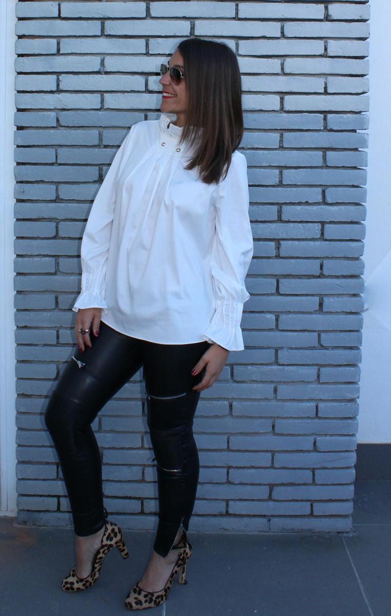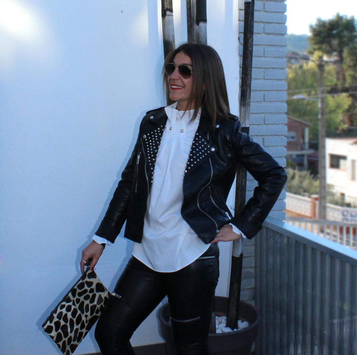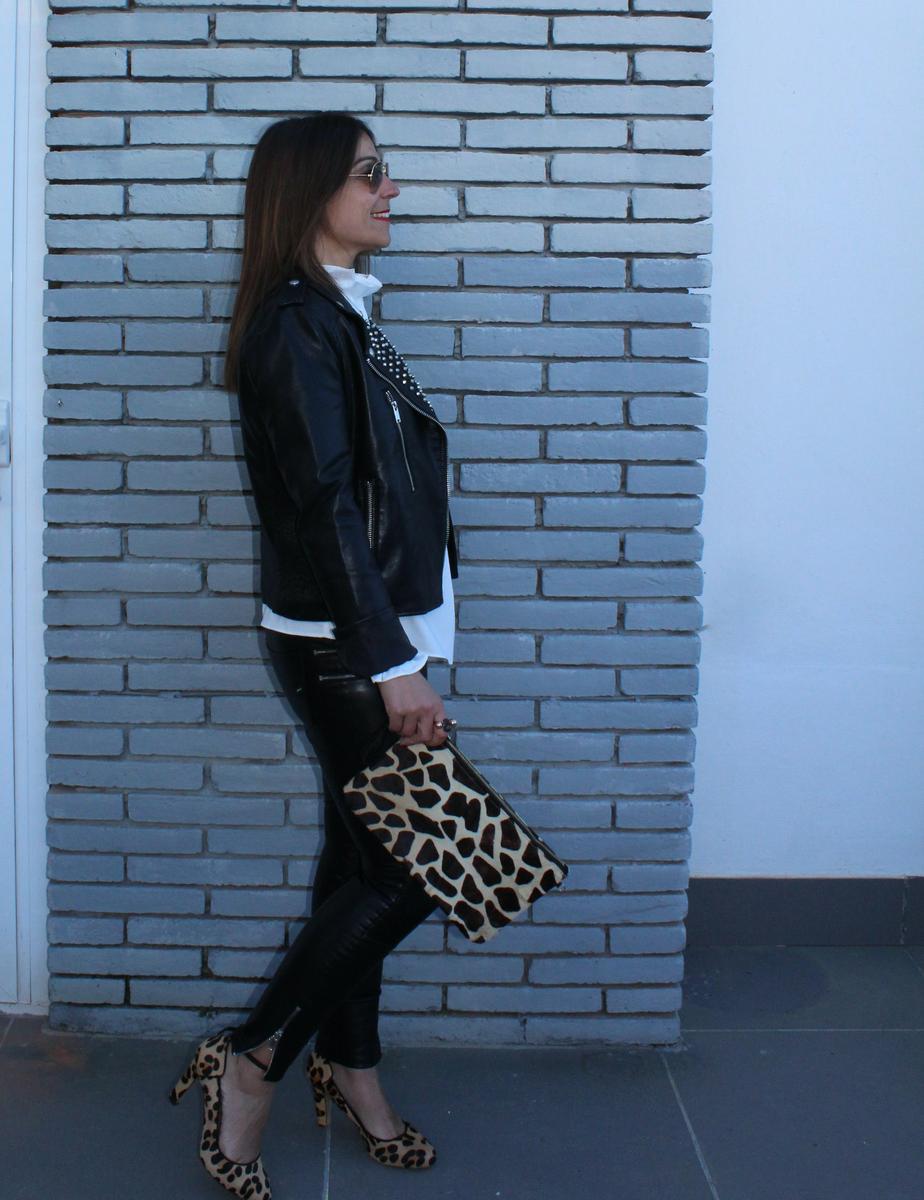 El resto del look biker de tachuelas, que parece que han querido irse pero no lo han conseguido y vuelven a estar muy presentes, pantalón de cuero y para los complementos, zapatos y bolso, he elegido uno de mis estampados preferidos, el leopardo.