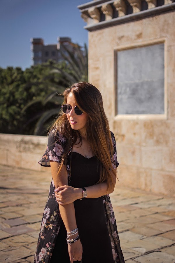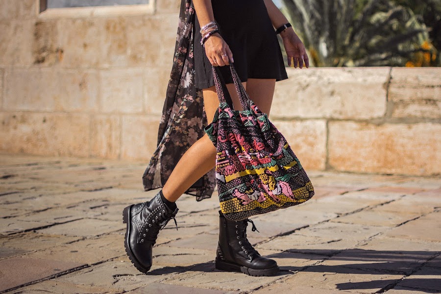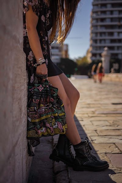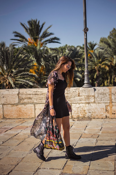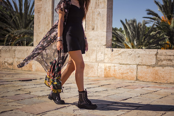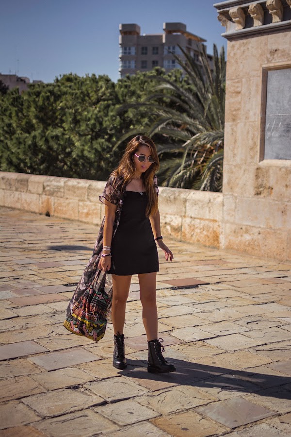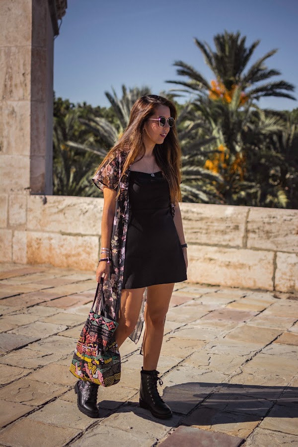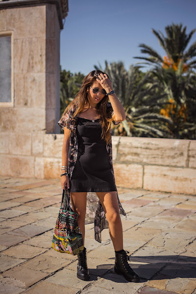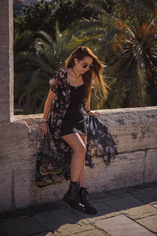 Cada nueva temporada, DAngela Shoes hace colecciones más bonitas. Esta vez, entre tantos modelos súper chulos, me decanté por las botas Alice, de estilo militar en color negro y llenas de tachuelas, lo que les da ese aire rockero que tanto me gusta y al que hacía tiempo que no recurría, y eso que me encanta. Quise seguir ese rollo rock con un vestido negro básico, de esos que nos salvan de todo y dándole color con el kimono de flores. También el color en el bolso, para huir de un total black. Si os fijáis bien y sois amantes de Sexo en Nueva York, lo llevaba Carrie Bradshaw en su visita al Zoco en la segunda película. Me sorprendió mucho cuando se lo vi hace años ya que lo tenía de un regalo que me habían traído de un viaje por allí. Nunca lo he usado demasiado, pero vi con este look el momento perfecto para enseñároslo.