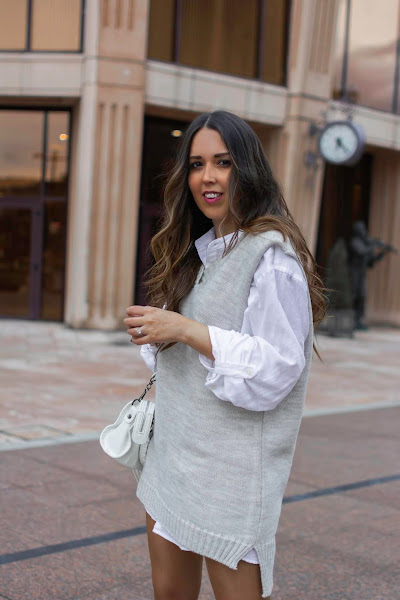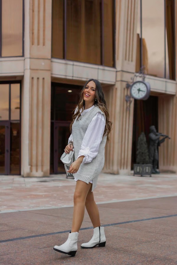 La camisa blanca es un fondo de armario básico, seguro que me habéis visto muchas veces con ella en los últimos meses y cada vez que la uso en un nuevo look, no tengo la sensación de que estoy repitiendo prenda. Como siempre os digo, podéis comprarla un par de tallas más o tomarla prestada del armario masculino que más a mano tengáis. Sobre ella, la tendencia de la que os hablaba en su versión más oversize, en un tono entre gris y beige que aunque largo, deja ver un poco aún del bajo de la camisa. Tenéis cientos de modelos en las tiendas todos conocemos, concretamente este lo he comprado en el marcadillo de mi barrio. Está claro que no tenemos que gastar mucho dinero para ir a la moda. Los botines Marila Shoes, 100% fabricados en España con los mejores materiales, de estilo cowboy y en un tono blanco roto. Nunca me había atrevido con un tono así y la verdad, ha sido todo un acierto porque me encanta la combinación. Además, súper cómodos y calentitos, geniales para el frío que tenemos a la vuelta de la esquina.