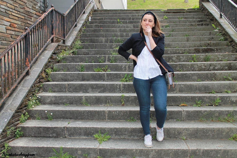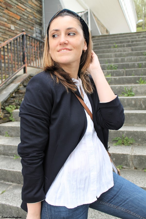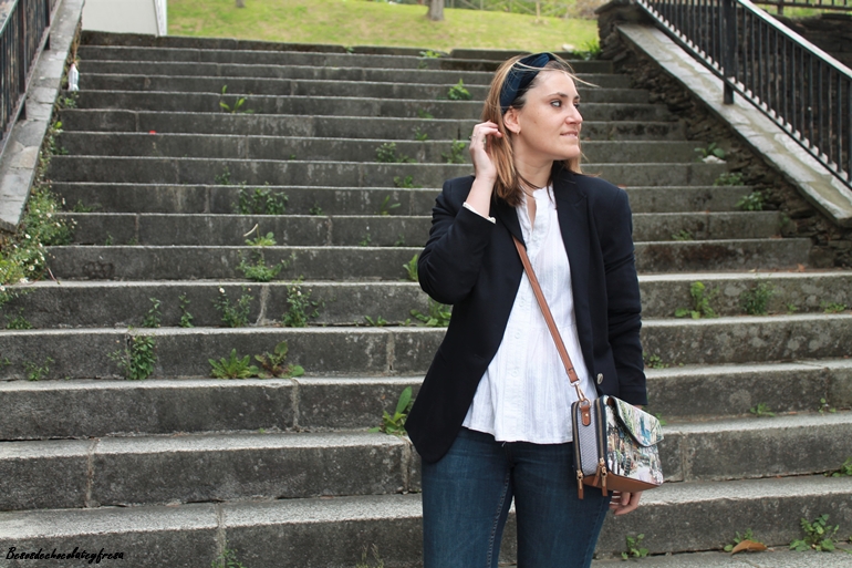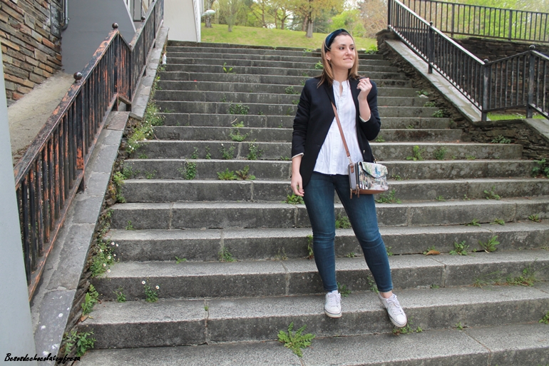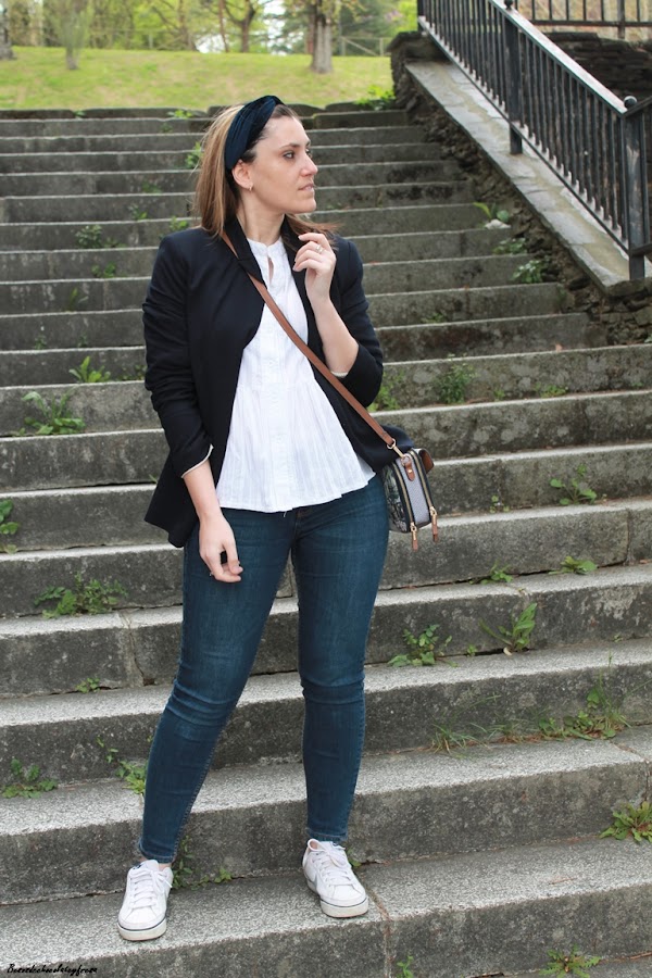 En el outfit de hoy me decantó por una clásica en color azul marino, que eleva al máximo el outfit compuesto por jeans y camisa blanca. Para completarlo sneakers blancas, bolso bandolera con estampado en tonos marrones y bandana de terciopelo a modo de diadema también del mimso tono de la blazer