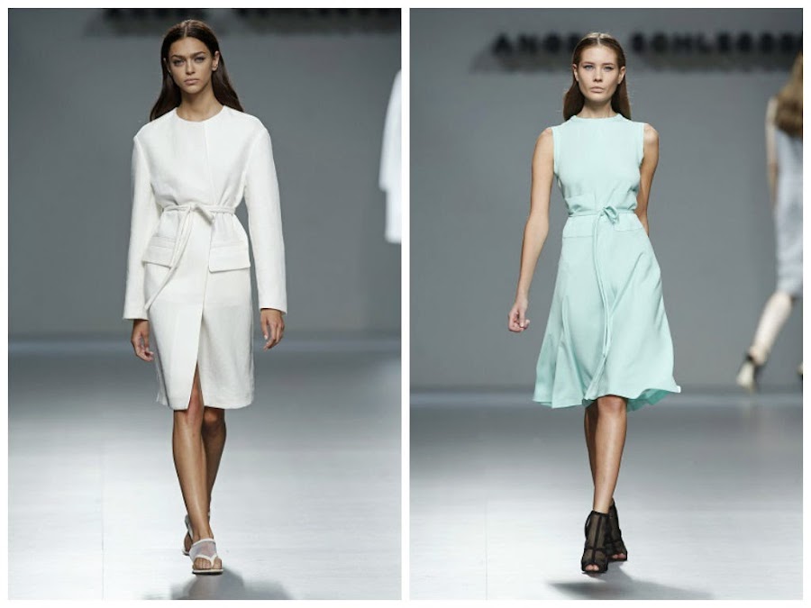 Del desfile primavera-verano 2014 de Ángel Schlesser le pueden venir muy bien este abrigo de entretiempo en blanco para ocasionesmás formales y el vestido verde agua que se ve fresco y vaporoso.