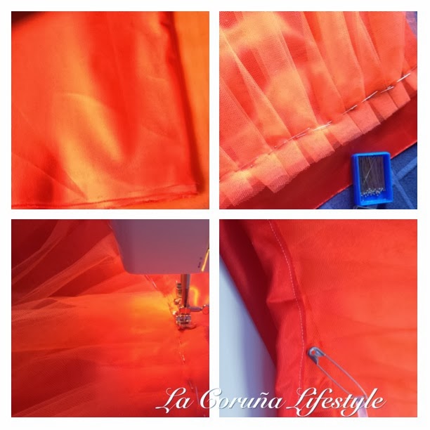 Todo empieza cuando veo unas fotos por internet de una niña monísima con una falda de tul naranja y me digo... eso se lo hago yo a mi niña !! Fui a comprar la tela, cortar, y cuando ya está todo cortado... me doy cuenta que al no haberle dado vuelo al forro.... el resultado no es el esperado.