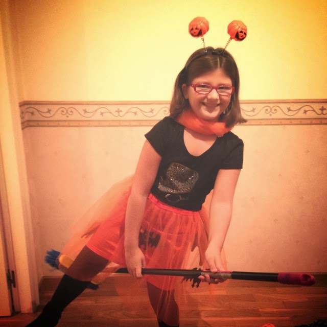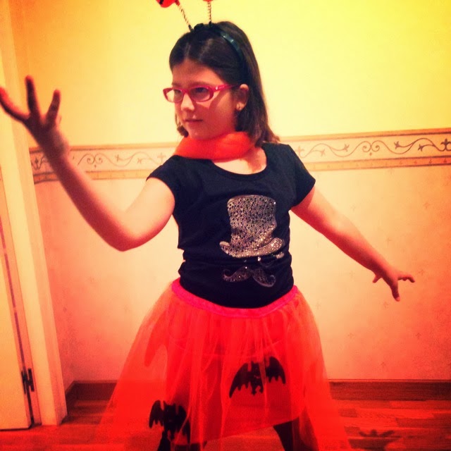 Entonces pienso en tunearla un poco... y le pongo los murciélagos... El resultado es el que veis.. .lo bueno es que a ella le ha encantado y se fue feliz de la vida con su falda de bruja y la camiseta del mostacho. Como nos sobraba algo de tul, pues a modo de fular... que hoy hace mucho frío y ... listo !