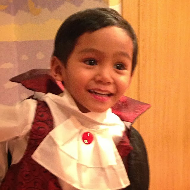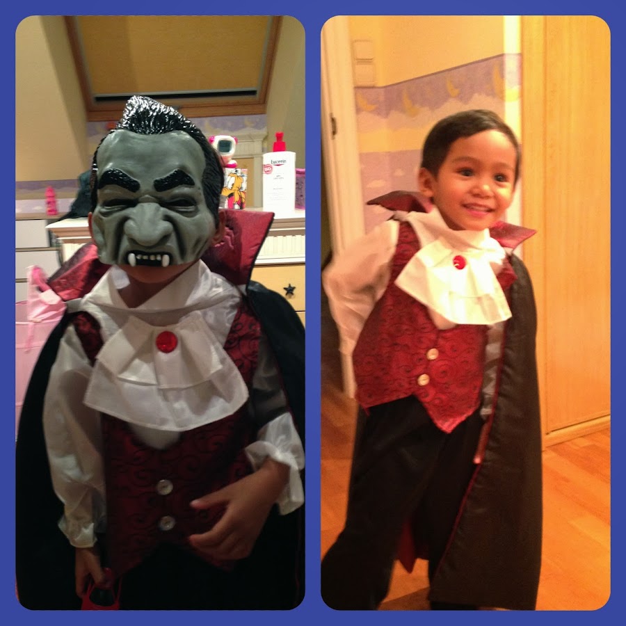 Lo mejor de todo viene ahora... porque claro.. el niño también tiene derecho y me fui directa al bazar de turno ( también llamado chinolandia) y le compré este disfraz de Conde Drácula que luce tan bien.