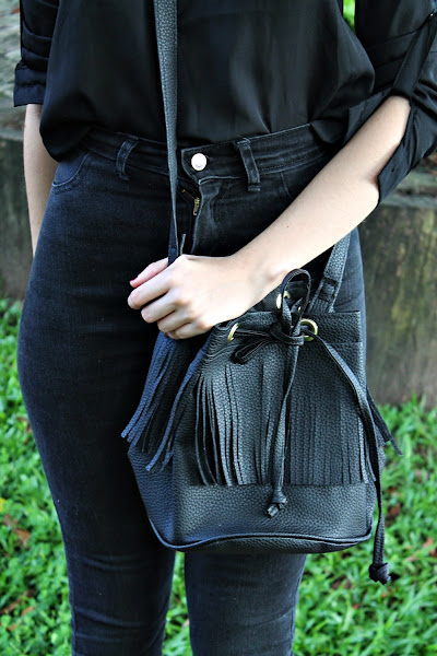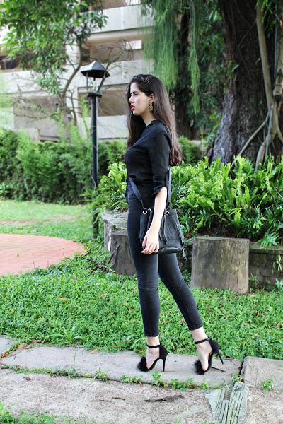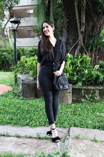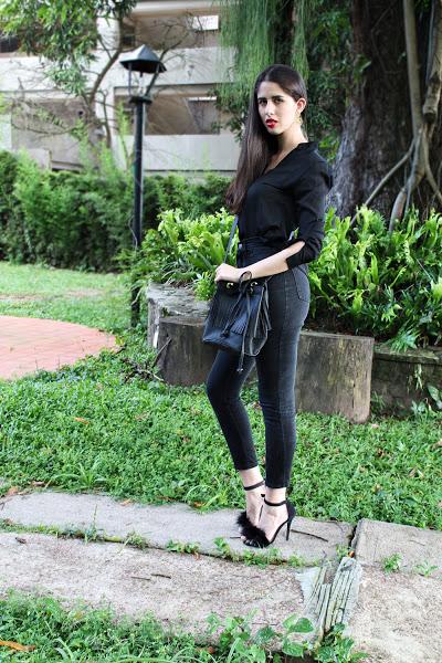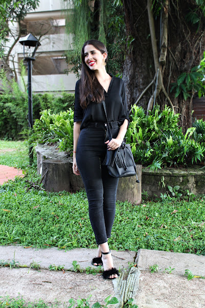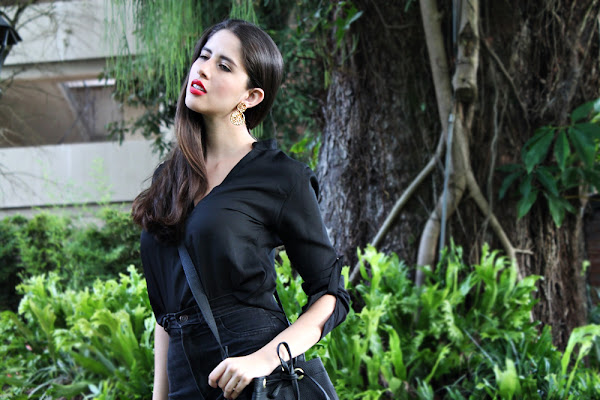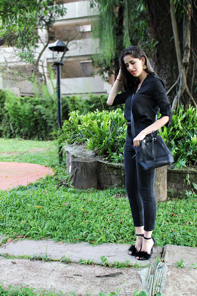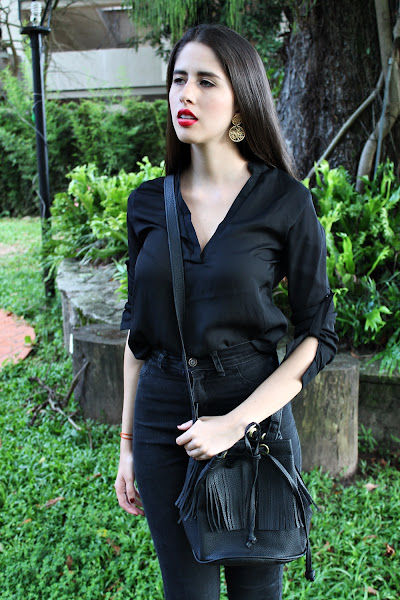 Una camisa en color negro es tan básica como una blanca, esta es un poco transparente y puedes usarla con looks tanto formales como cosas más informales y quedará bien con todo, el jean negro corte alto ya me lo han visto en diferentes ocasiones (1 - 2 - 3) y como pueden ver es muy versátil, unos zapatos con plumitas y mi nuevo bolso de Riot Anatomic de flecos, si me siguen en mis redes sabrán lo obsesionada que estoy últimamente con TODO lo que lleve flecos y por supuesto los hermosos zarcillos Ananá para LuJo Accesorios; para romper con todo lo negro del look nada mejor que unos buenos labios rojos ¿No Crees?