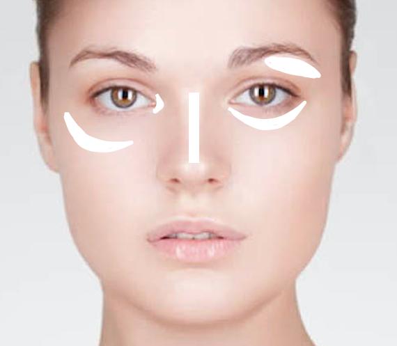 Usa iluminador en zonas específicas de tu cara. Si no tienes uno usa sombra en crema color marfil o una base de maquillaje clara. Póntelo en las zonas que deseas destacar o iluminar, preferiblemente en las zonas que se señalan en la imagen de más arriba; te darán un aspecto más fresco.