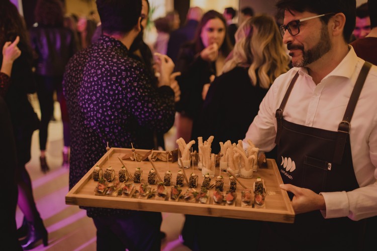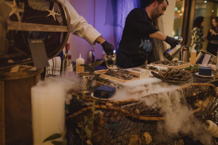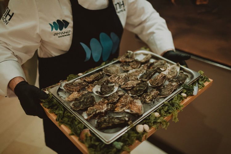 El aperitivo incluyó distintas estaciones y cocina en directo, con delicias del tipo ostras al natural con lima, almejas a la marinera o ceviches. También bocados servidos en forma de calamar fresco y espuma cítrica; croquetas de bogavante y mango; hosomaki de salmón marinado y sus huevas; langostinos tigre con chipotle; y sardina ahumada con queso La peral y manzana rosa, entre otros.