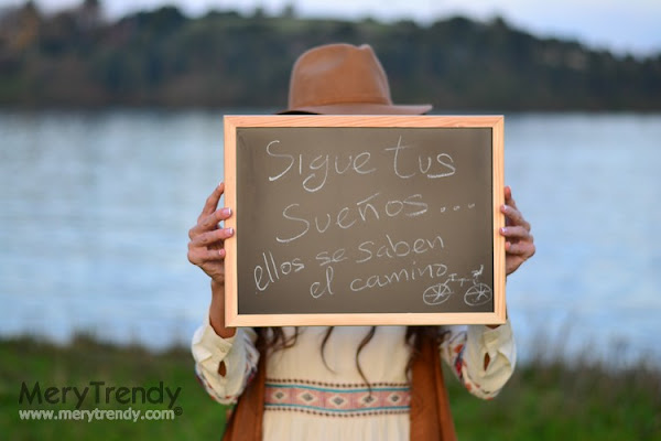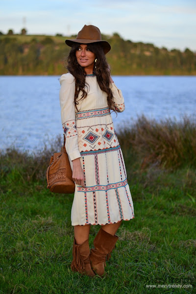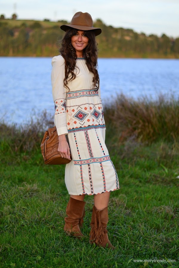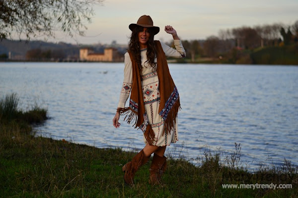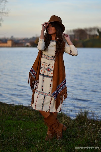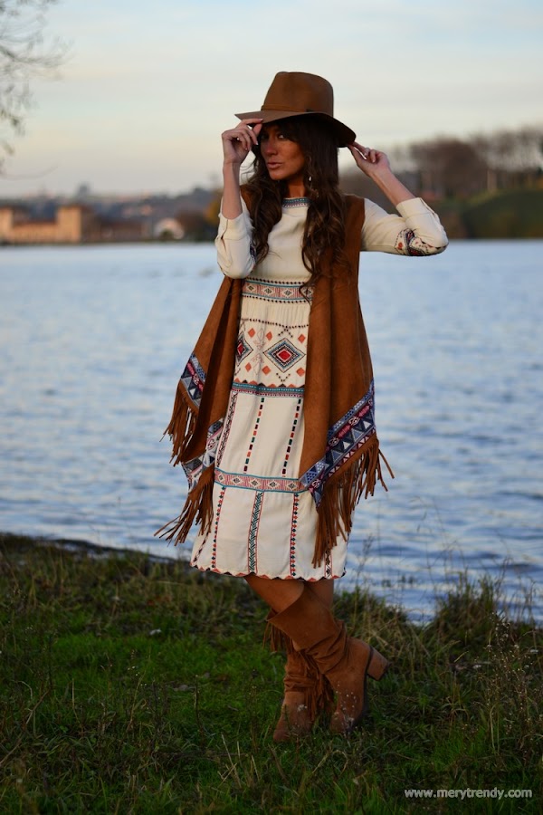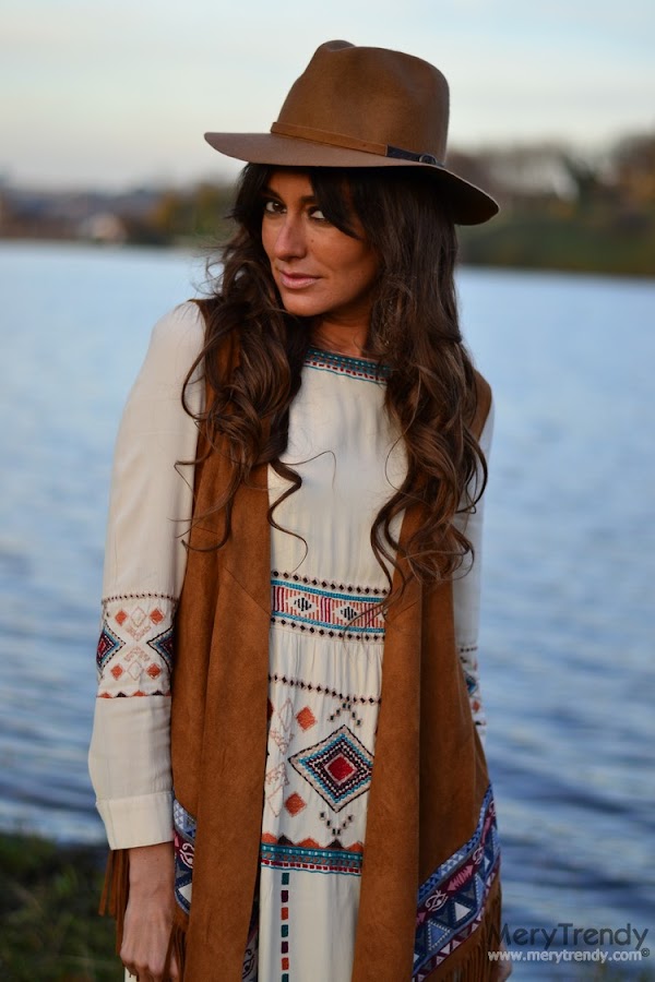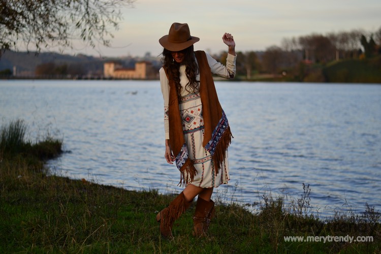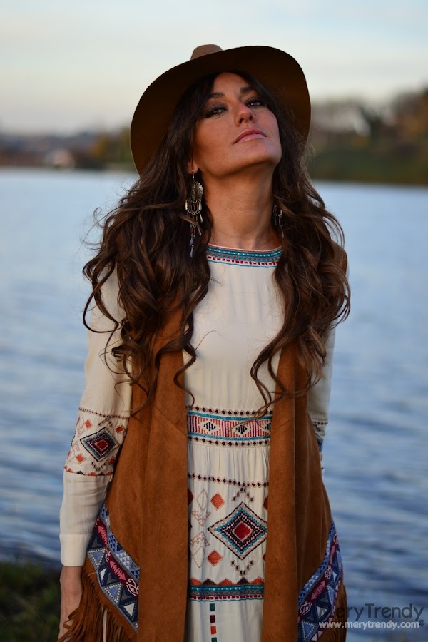En esta ocasión, he querido darle un toque más desenfadado que entonces. Por eso lo he combinado con botas de ante en color camel con flecos laterales y acabado gastado de aire folk, bolso tipo saco con cenefa, sobrero de cowboy y chaleco de estilo étnico, también con flecos.