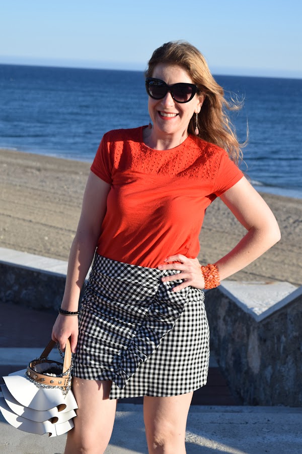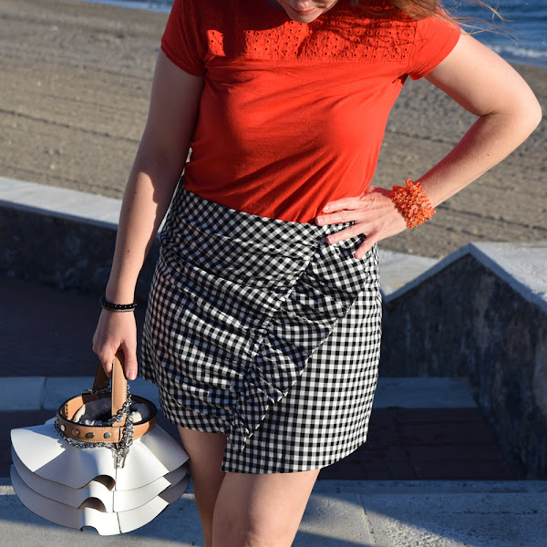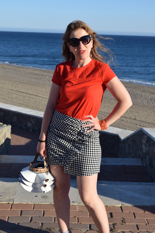 Me gusta mucho este estampado a base de pequeños cuadrados monocolores. La falda de cuadros vichy en negro y con volante frontal, fue un éxito de ventas del imperio Inditex, muy utilizada por mi durante el invierno, y que ahora con el calor seguiré llevando.
