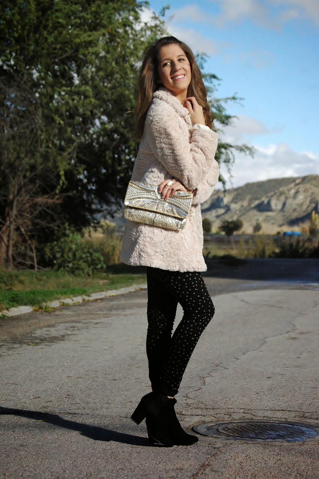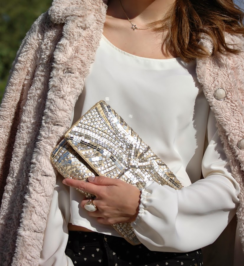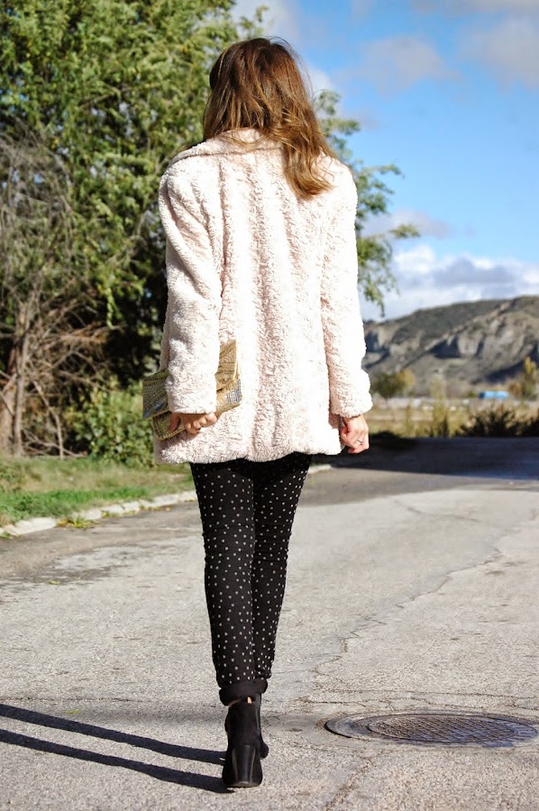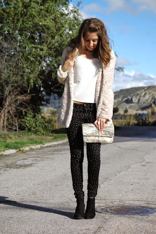 Ya tengo en mente mil looks con él, que por supuestísimo os iré enseñando. Se que en estas fiestas de Navidad va a ser la pieza clave en algún look importante. De momento hoy os traigo este outfit en el cual lo he combinado con unos pantalones negros con corazones pequeños de fieltro en beige y mi abrigo favorito de pelo, tendencia esta temporada.