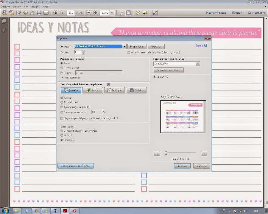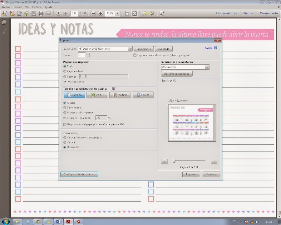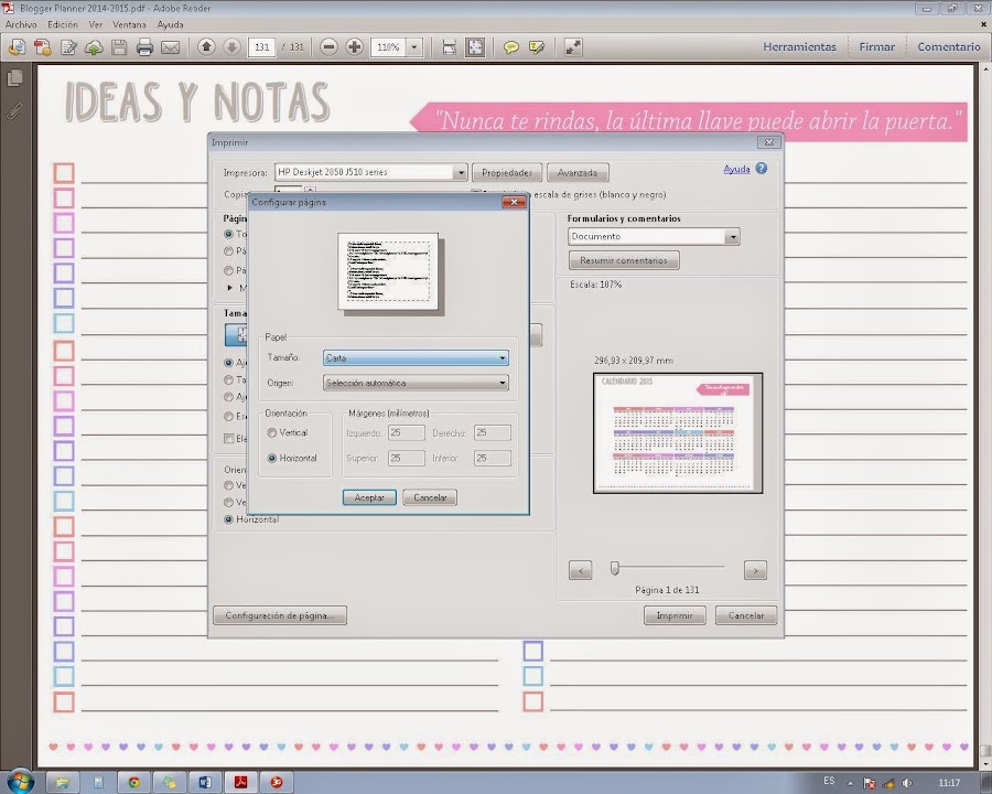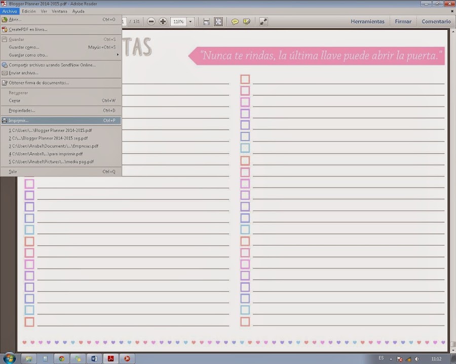 Esta agenda contiene muchas páginas pero yo la diseñe con tonos pasteles y colores muy suaves, para no gastar tanta tinta imprimiendo, sobre todo para ahorrar tinta negra que es la que mayormente se utiliza para Informes, trabajos, entre otros. La agenda viene en hoja tamaño carta y está en tipo de archivo PDF. Para imprimirla solo necesitas tener instalado en tu pc algún lector de PDF, recomiendo Adobe Reader.