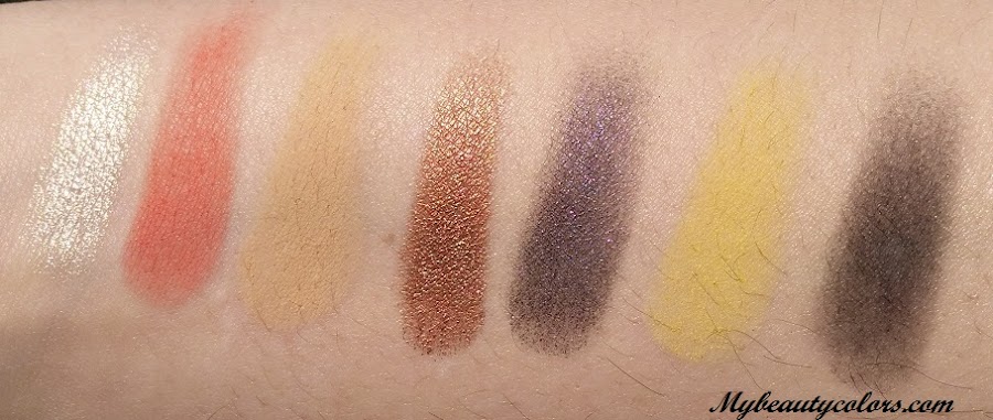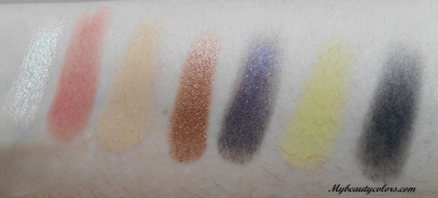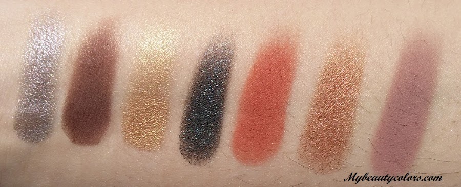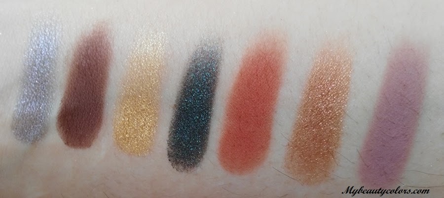 Como podéis comprobar, es preciosa, mucho más en persona. Las sombras brillantes tienen una textura muy suave, como de mantequilla. Las mates, son un poco más secas pero agradables al tacto. En cuanto a la pigmentación, debo decir que es buenísima. Son unas sombras de gran calidad y se nota. Para que podáis verlo mejor, os dejo unos swatches que he hecho con el dedo directamente sobre el brazo, sin prebases ni filtros. El color se corresponde al real.