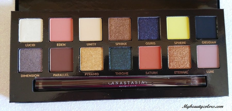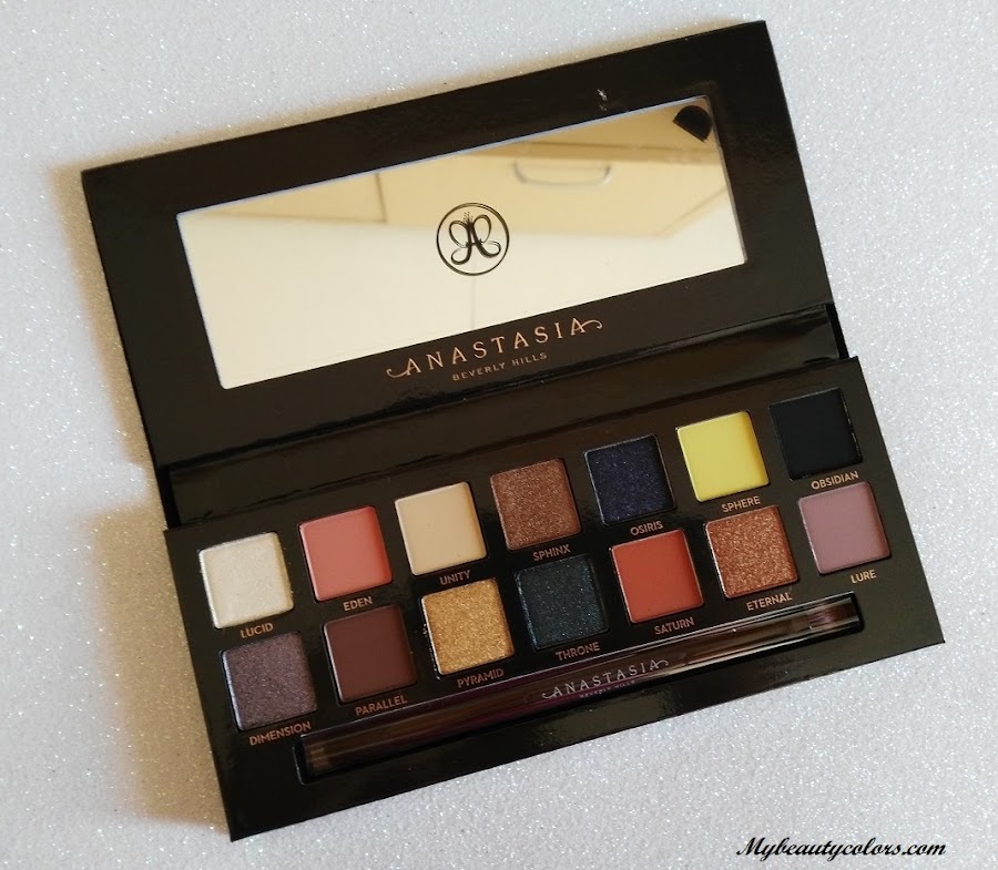 Y ahora sí, abrimos la paleta y podemos ver un gran espejo en la parte superior, protegido por un plástico transparente con el logo de Anastasia Beverly Hills. En la parte inferior, 14 preciosas sombras de acabados mate y brillante y tonos entre cálidos y fríos. Para completar la paleta, encontramos una brocha doble con pelo muy suave, para aplicar las sombras. Aún no la he probado pero se ve de calidad.