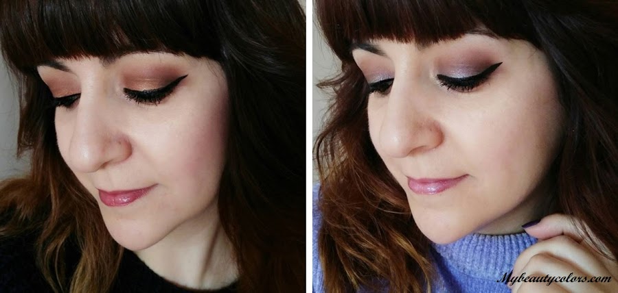 ¿Que os parecen? Preciosos ¿verdad? A mi me tiene enamorada. Ya he hecho un par de maquillajes con ella y no es nada polvorienta, las sombras se trabajan muy bien. Lo único que puedo decir es que los tonos brillantes, al aplicarlos con brocha, pierden intensidad, así que si queremos que quede el maquillaje más intenso, lo mejor es aplicarlos con el dedo. Por lo demás, no tengo ninguna pega. Para que podáis ver como quedan puestas, os dejaré los dos maquillajes que me he hecho hasta ahora. Debo decir que yo siempre llevo prebase para que las sombras me aguanten perfectas todo el día, así que no se cuanto pueden durar sin ella.