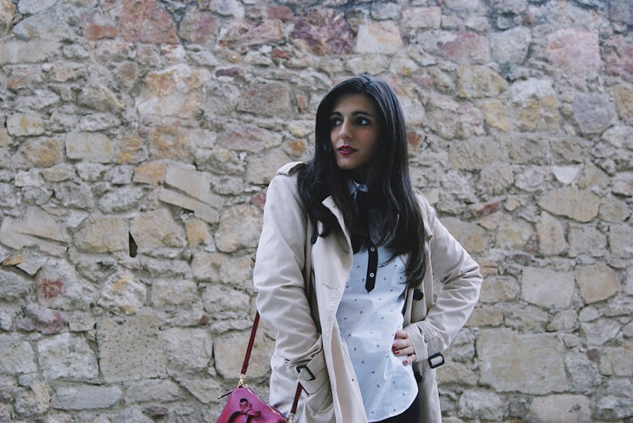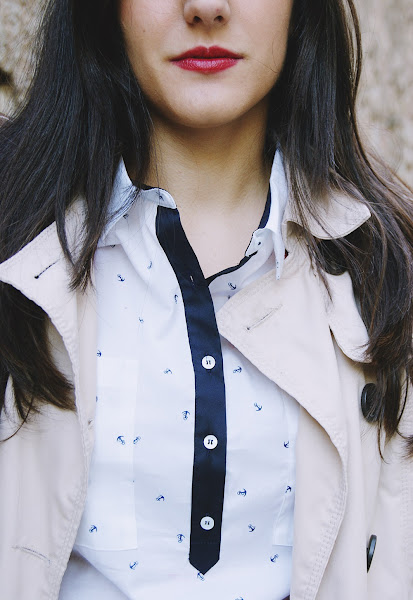 La camisa es una monada. Elegante, pero no muy seria, pues no tiene botones hasta abajo. Tiene apariencia de blusa. Es perfecta para estos días porque sus mangas se pueden acortar fácilmente. Es muy estrecha en la cadera, la verdad, pero en el tronco se adapta muy bien y resulta comodísima. Pese a que sus anclitas son azul marinas, se combina fácilmente con negros, como yo he hecho, ya que son pequeñitas y no destacan mucho. Lo que más me gusta es que es versátil, porque se adapta muy bien a looks casuales como a conjuntos más especiales.