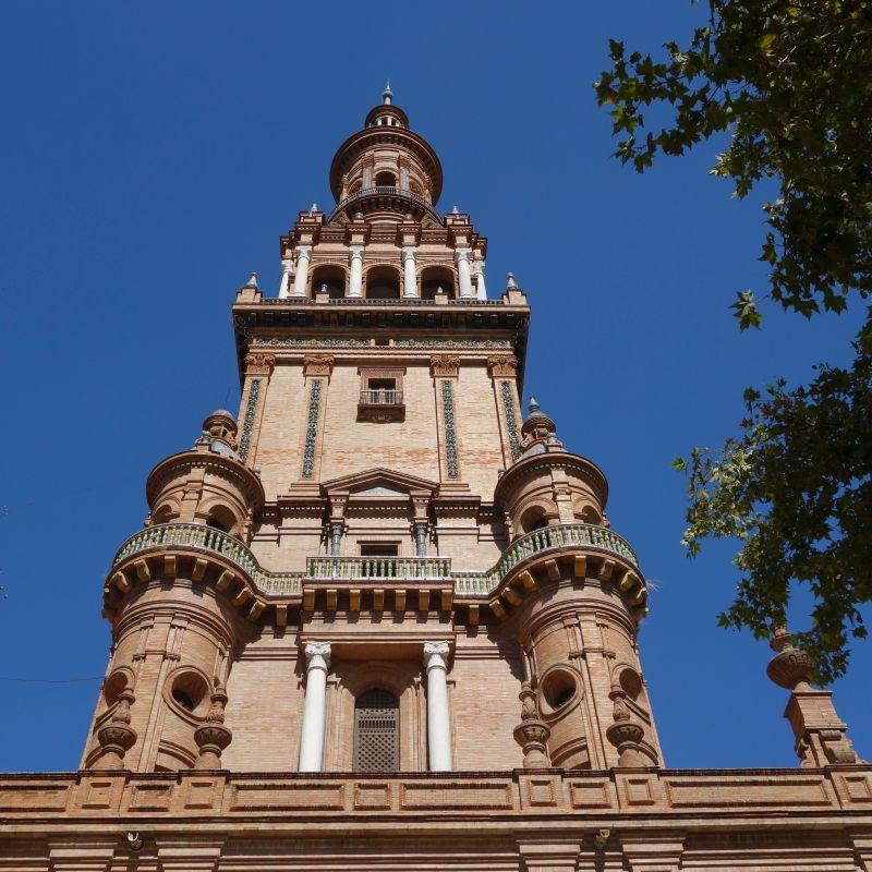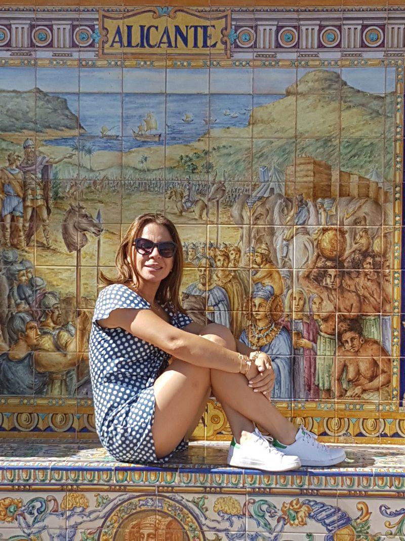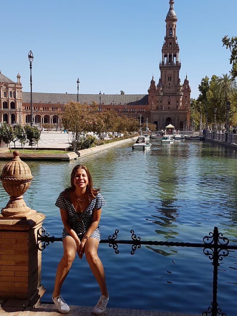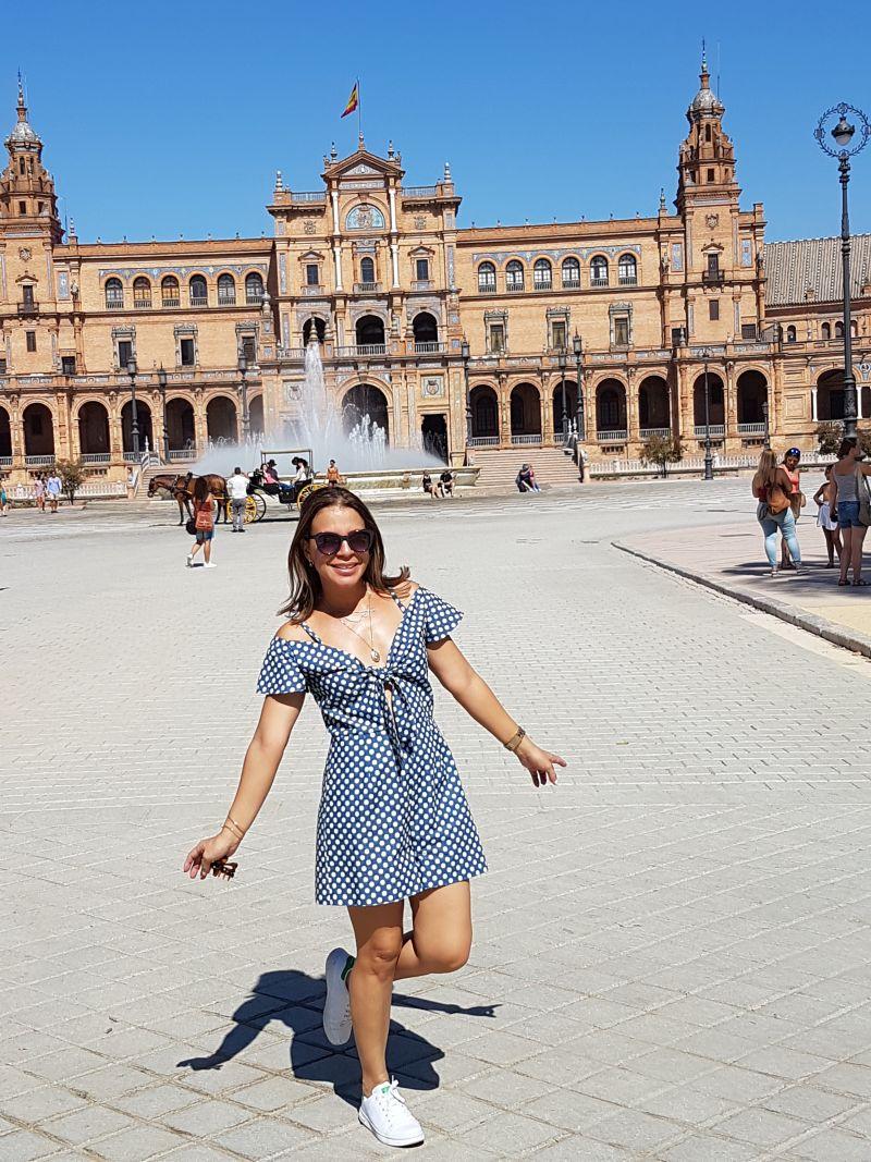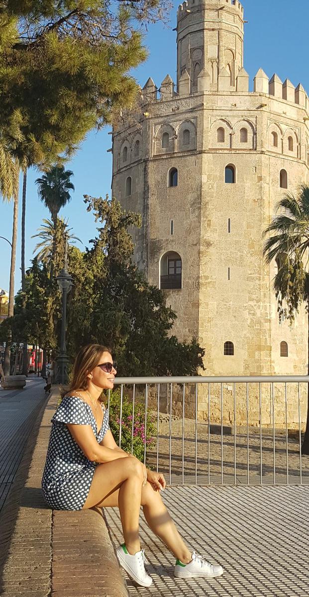 El segundo día, fui a Sevilla, y quise hacer honor a esta ciudad flamenca, de hermosos vestidos llenos de colores, vuelos y topos (lunares); así que desde hace unos meses que estuve preparando el viaje (el cuál, estuvo muy pospuesto) diseñé un mono en topos mezclando detalles que han estado muy trend en este verano; los vuelos (que los lleva en las mangas) y el nudo delantero, acorde para este día. Las fotos tomada en la Plaza España y el la torre del Oro.