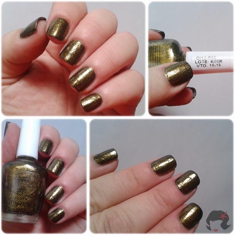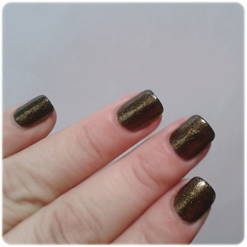 Algo para destacar es que, como les dije el tono es algo rato, cuando lo aplicas pareciera que te hubieses puesto una base negra y sobre ella el esmalte, pero no es así, es solo el esmalte, al sol la cosa cambia y mucho, tiene un efecto por lo menos para mi extraño y que lo hace super lindo, cambia del verde musgo al dorado según como le de el sol (o la luz) y eso hizo que me lo elogiaran varias veces, no es duocromo, lo aclaro por las dudas, pero si es un lindo efecto que tienen los microglitters de este esmalte.