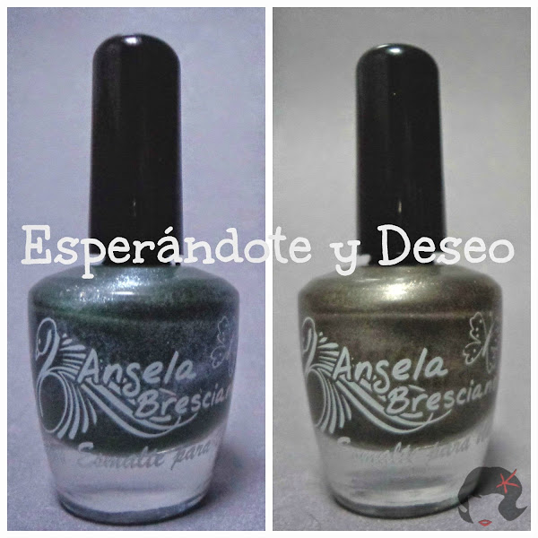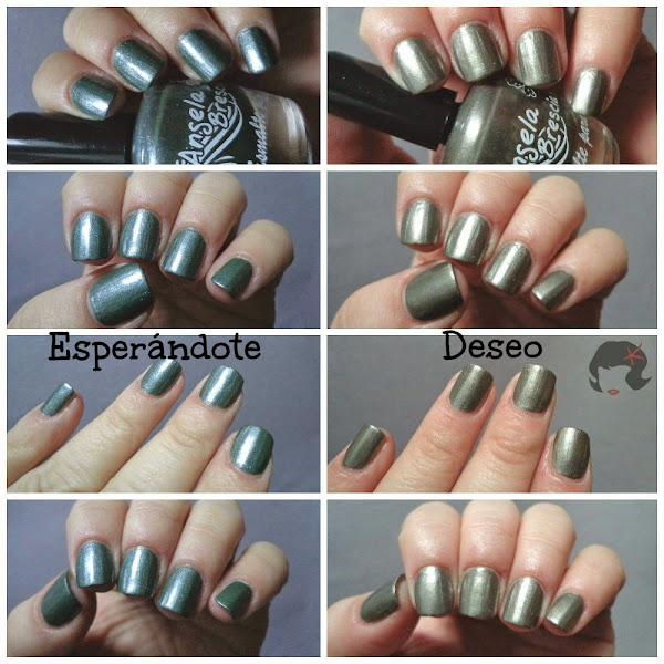 Lo aclaro porque en la entrada de Meli, que fue quien bautizó la colección hace referncia a uno como verde y al otro como una mezcla de dorado y plateado, pero les juro que en mis uñas los dos son verdes, Esperándote es más bien un verde militar y Deseo un verde musgo.