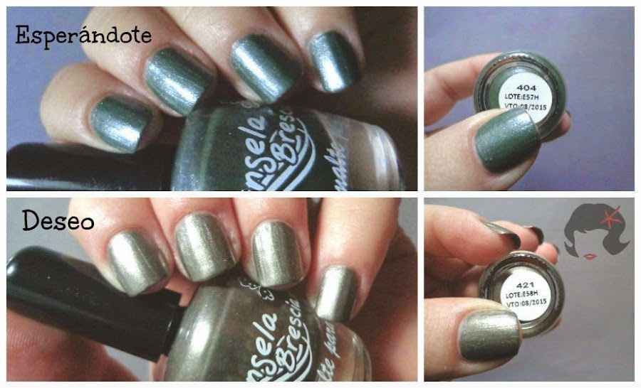 Me gustaron los dos, pero adoré Esperándote, que no solo es verde, sino que es el más oscuro de los dos, Deseo también es muy lindo y creo que según la ocasión utilizaría cualquiera de los dos, mientras escribo esto no puedo dejar de pensar en que son verdes, en lo mucho que están cambiando mis gustos esmalteriles y que tengo que comprarme algún otro verde!!