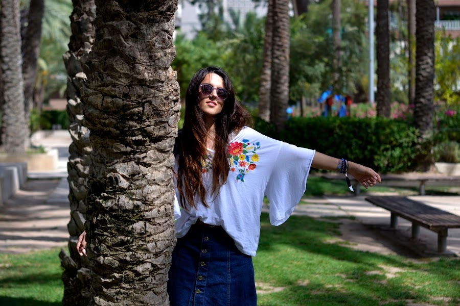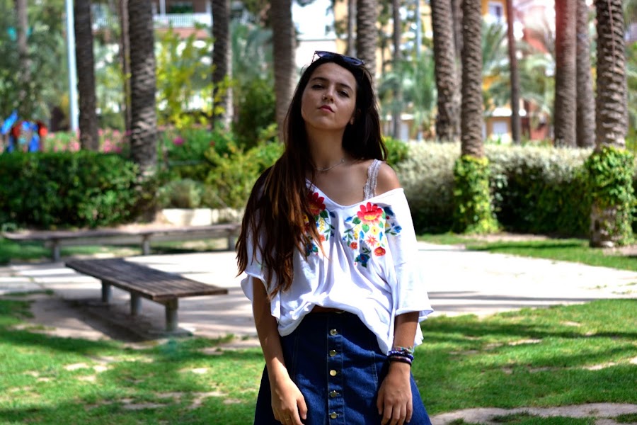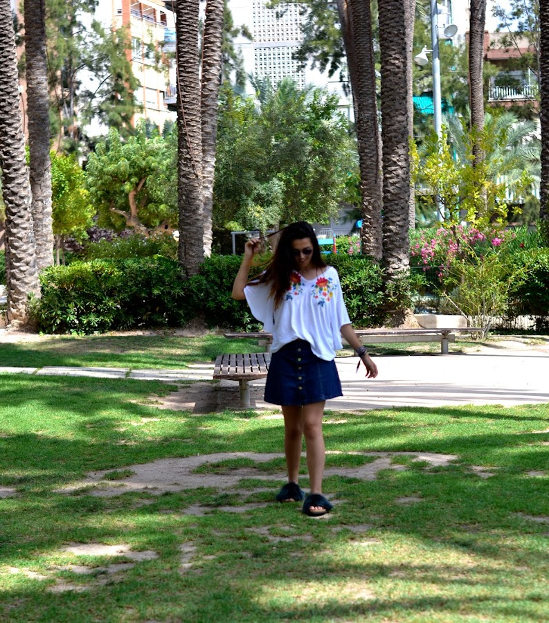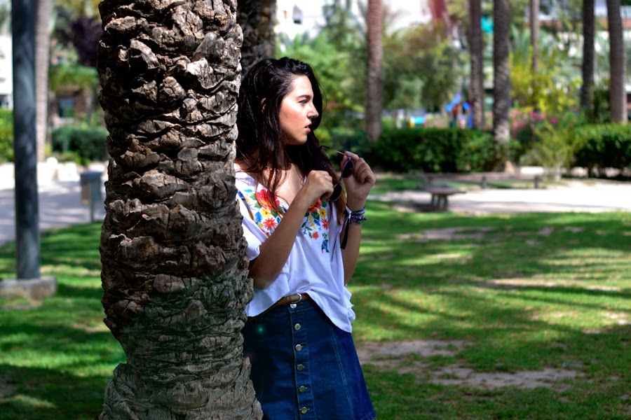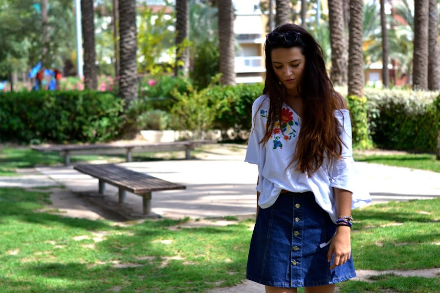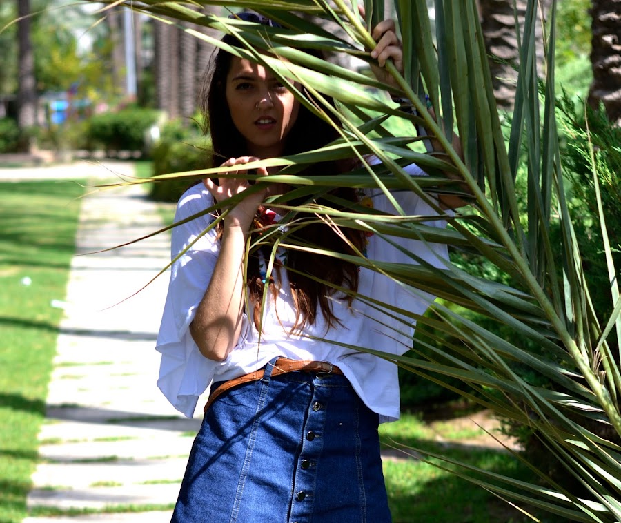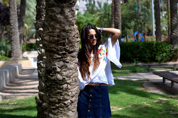 En verano sólo apetecen outfits frescos y cómodos y e aquí uno de ellos. Otra ganga más de las rebajas en Zara (a 7.99) supongo que os habréis dado cuenta de que me queda algo grande, era la única talla que quedaba y como no me disgustaba el efecto me la llevé y ya de paso la comparto con mi preciosa señora madre que adora este tipo de camisetas. Para combinarla nada más ni nada menos que una falda denim abotonada ¿sencillito no?.