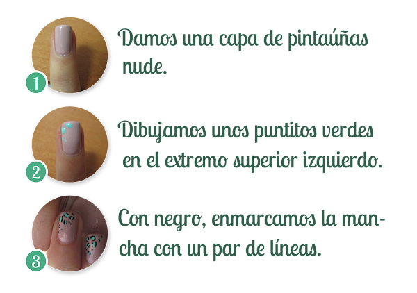 Quiero que prestéis atención al paso número 3: lo mejor para que el estampado quede lo más animal posible es hacer líneas algo irregulares, bordeando la mancha por dos lados. Si no termináis de verlo bien en mi imagen, podéis buscar cualquier dibujo de ese tipo de estampado en Google y recrearlo en vuestra manicura.