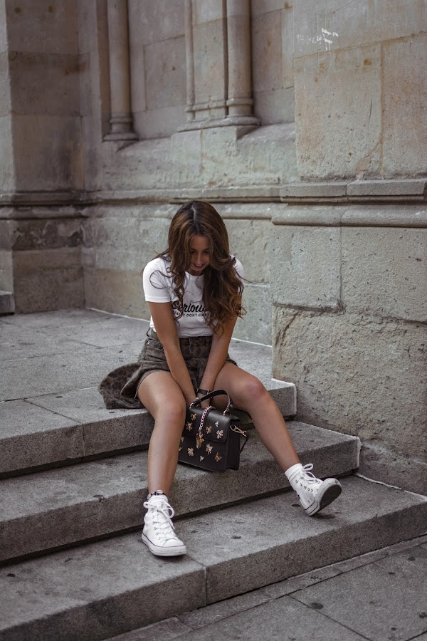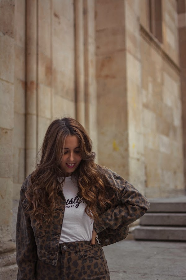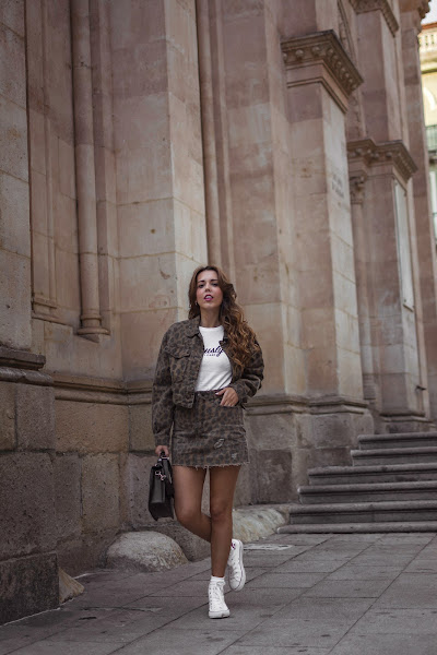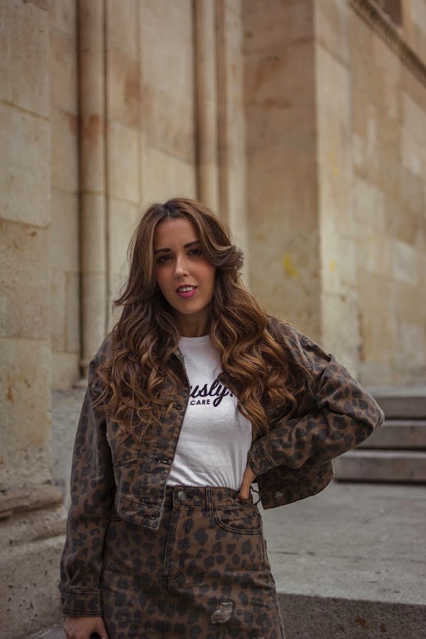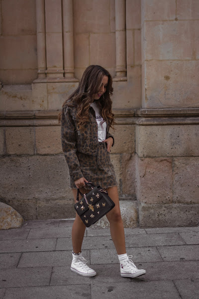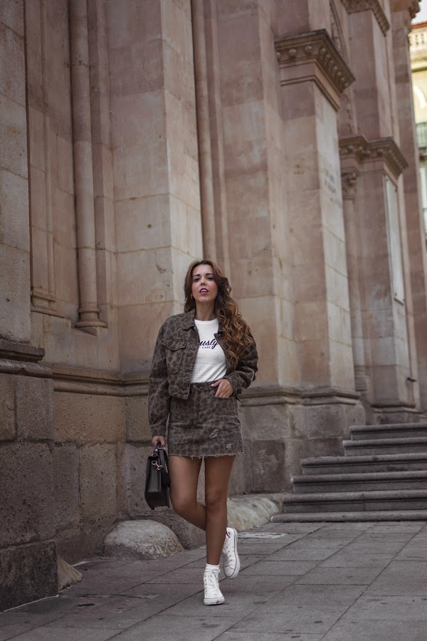 Para hoy he escogido un conjunto de dos piezas, de cazadora y falda en textura denim con el estampado de moda. La falda es de cintura alta con pequeños rotos e hilos en su final, al igual que la cazadora oversize que le da un rollo vintage y despreocupado al outfit. Como os decía antes, para un estampado tan llamativo, siempre debemos recurrir a pequeños toques de color en los complementos y sobre todo, a cosas que no sean muy recargadas para que así la atención, sea acaparada solamente por las prendas principales. Una sencilla camiseta blanca con mensaje, es la prenda perfecta para cerrar el look, con deportivas del mismo color y un bolso en color negro con detalles dorados.