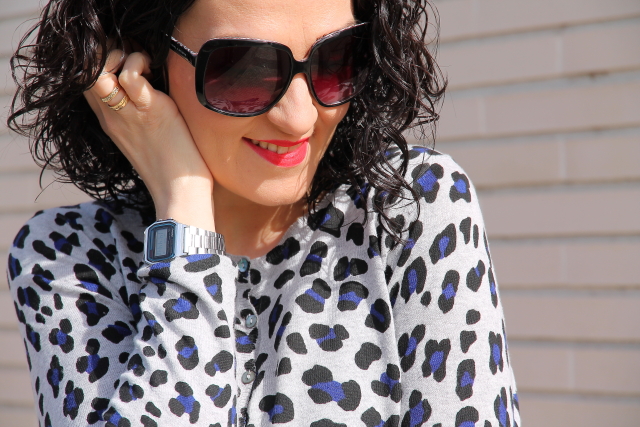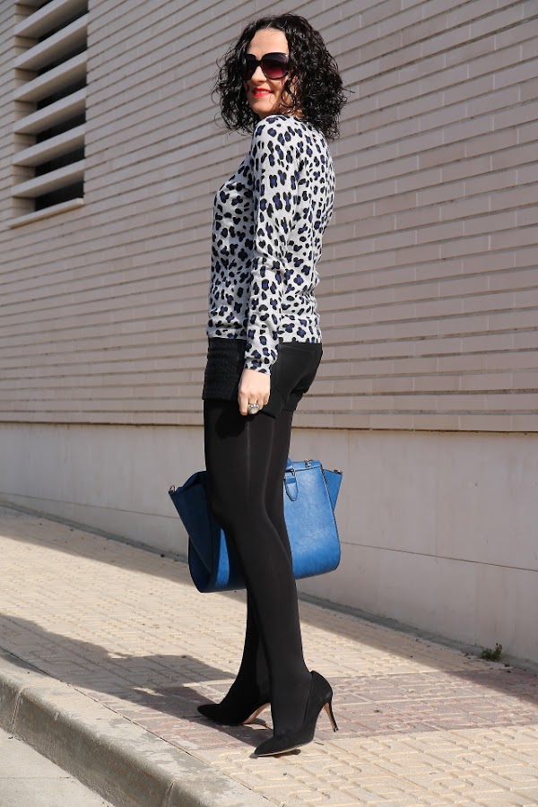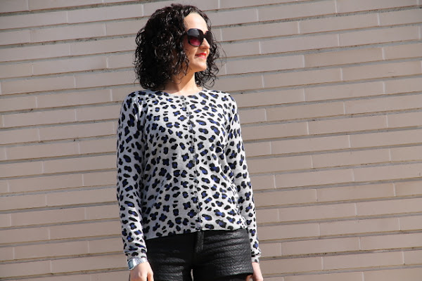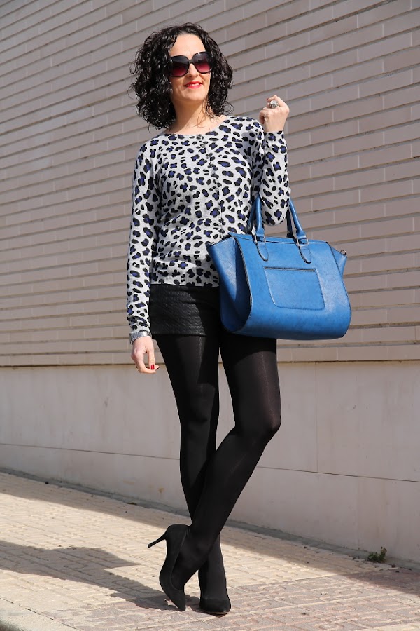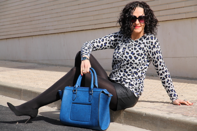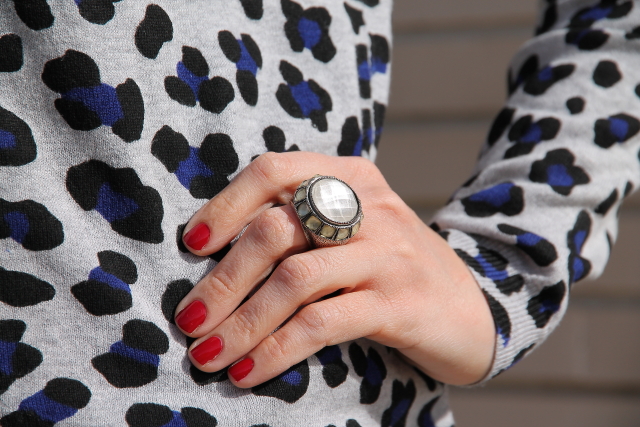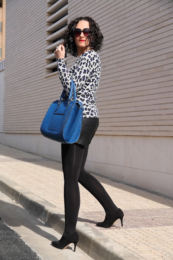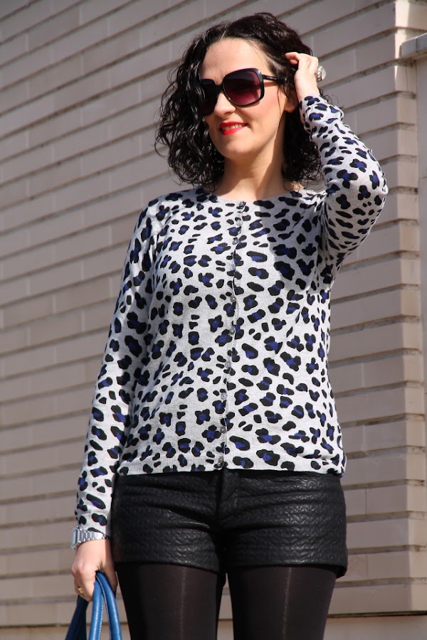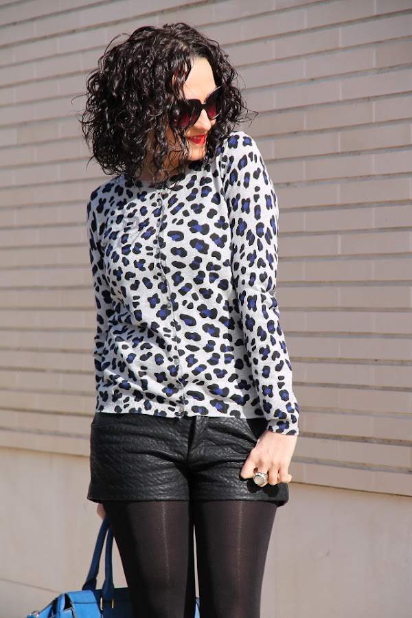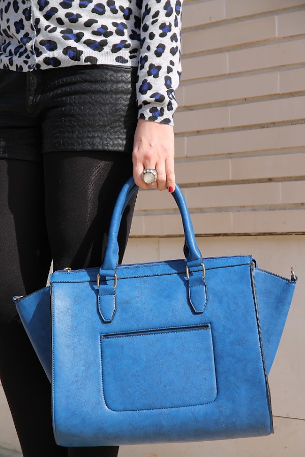 Aunque el gris no me apasiona demasiado cuando vi esta chaqueta que combinaba el gris con el animal print en negro y azul Klein no pude evitar probármela, como ya sabéis el estampado felino me encanta. Como era de imaginar la chaqueta se vino conmigo y la verdad que estoy super contenta con la compra, los looks que resultan con ella cuando la combino con negro me gustan muchísimo como es el caso de hoy con shorts de piel y stilettos negros. Para los complementos he elegido un anillo XXL y mi querido bolso azul Klein.
