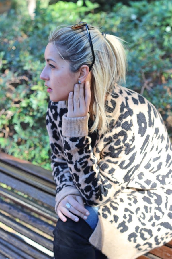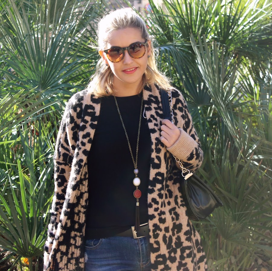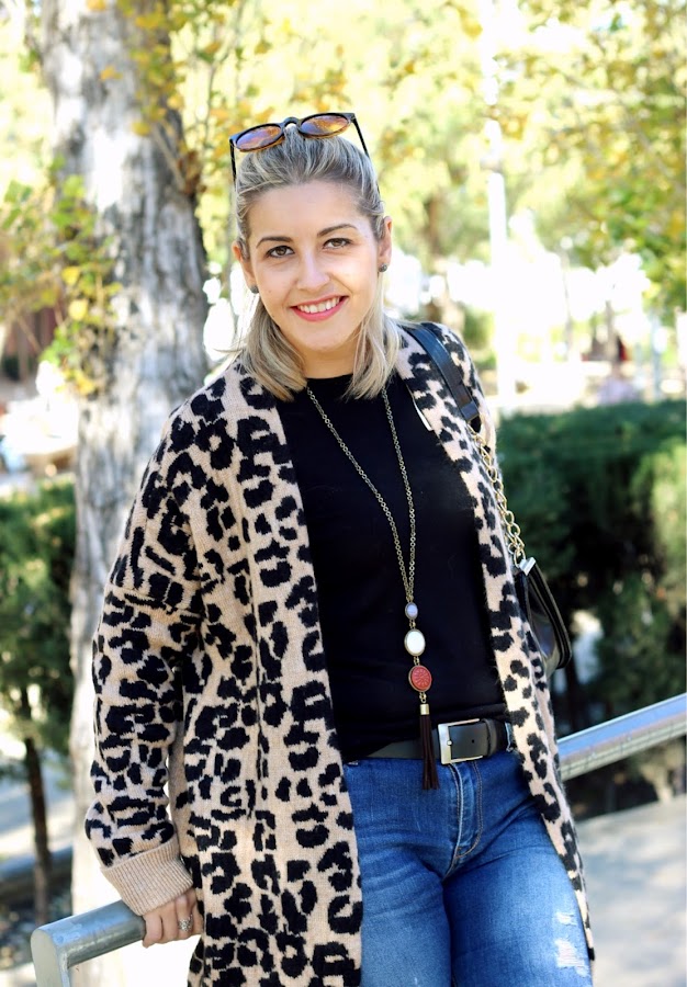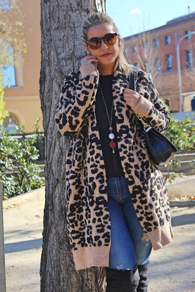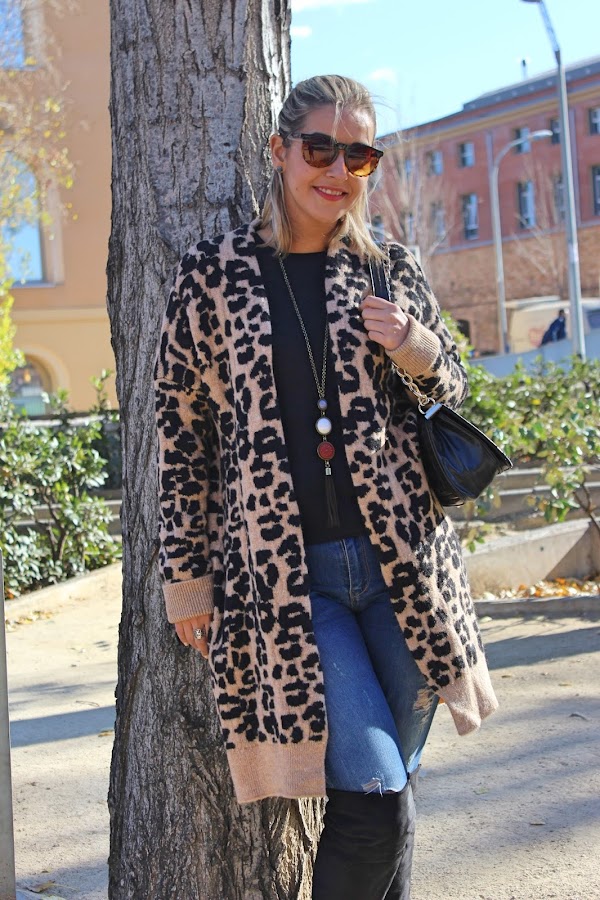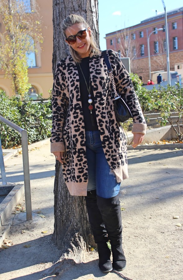 In the outfit of the day, I show you my new long knitted jacket with animal print that I bought in the Sales and its very warm. I mixed with a black sweater and ripped jeans. The accessories of the outfit were my black boots over the knees and my black bag similar to Chanel. A comfy and warm outfit thats its perfect for these cold days.