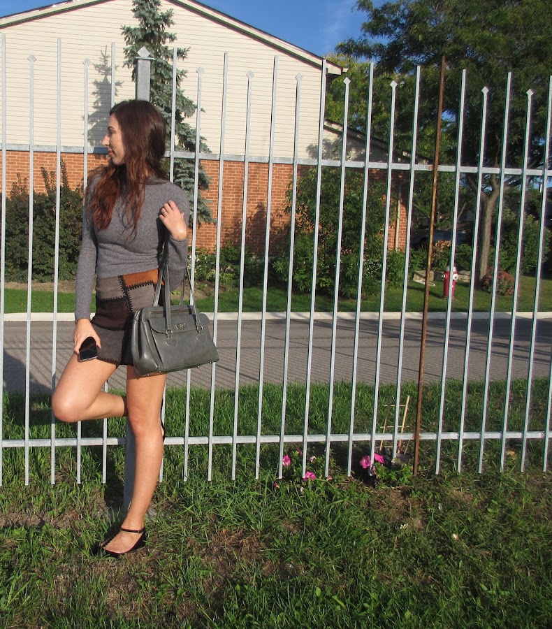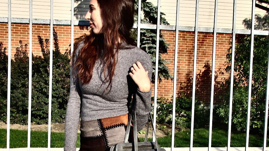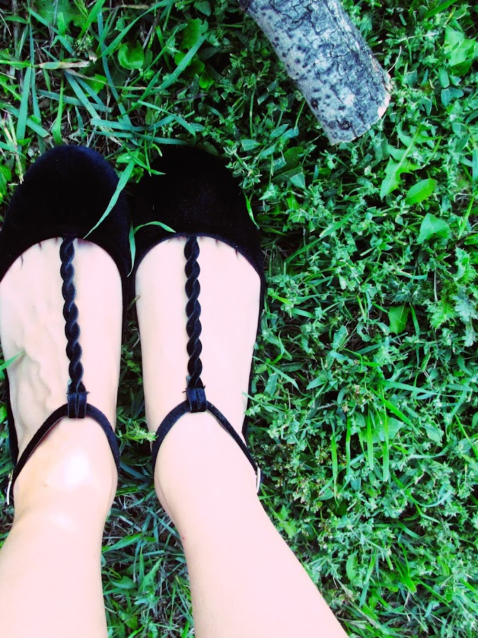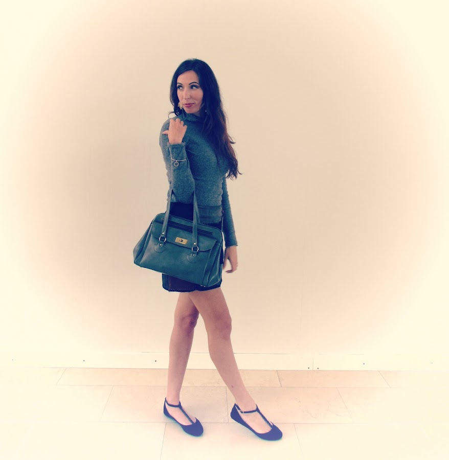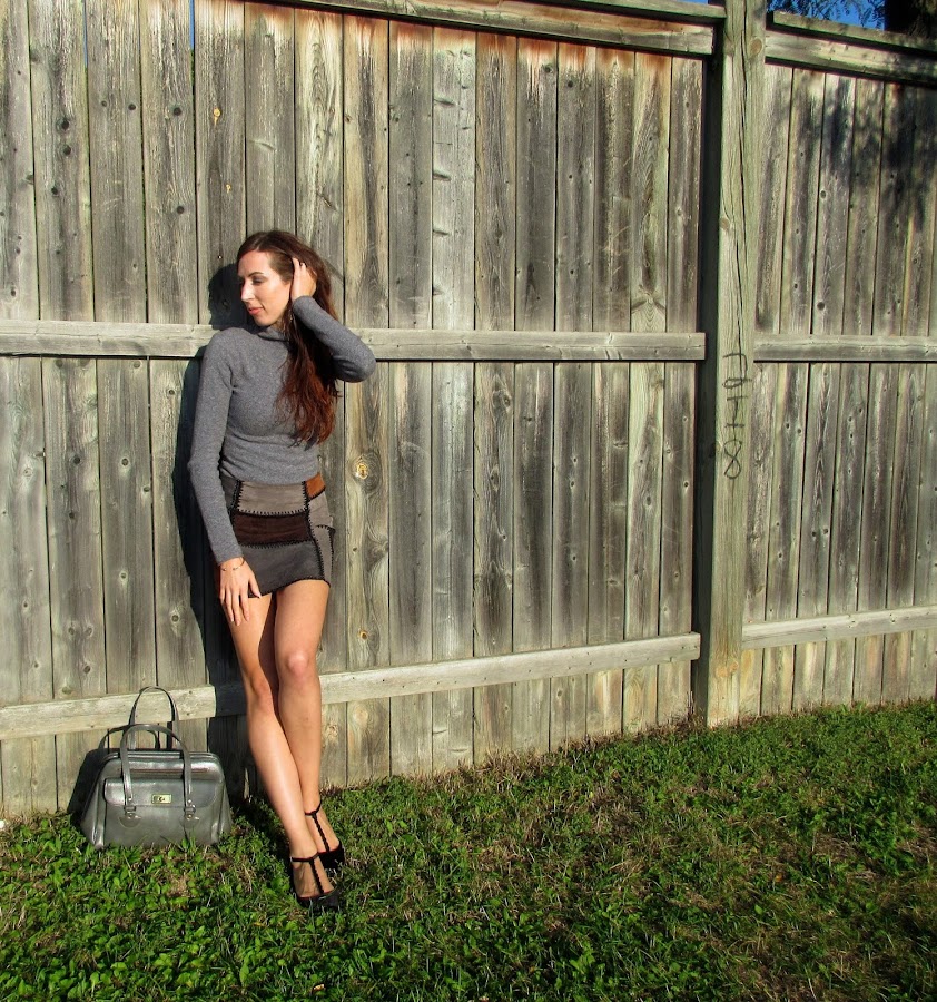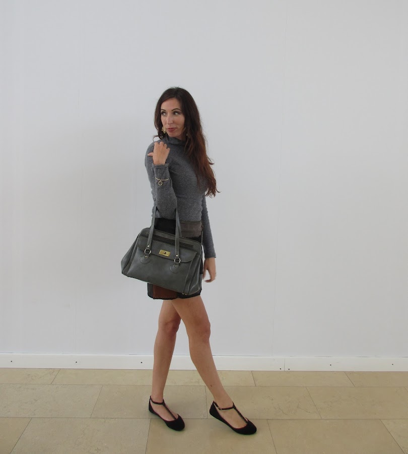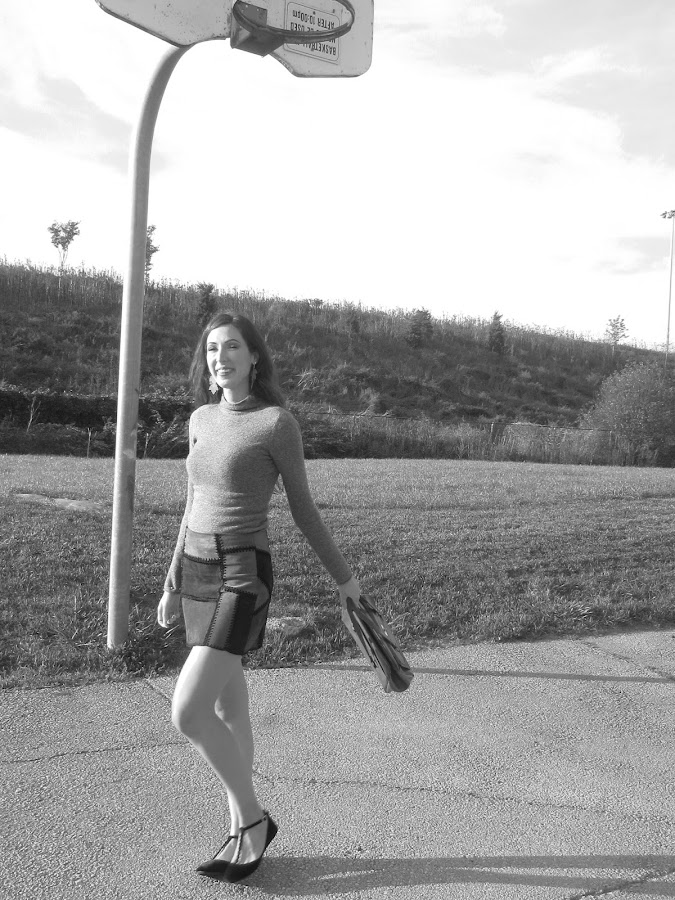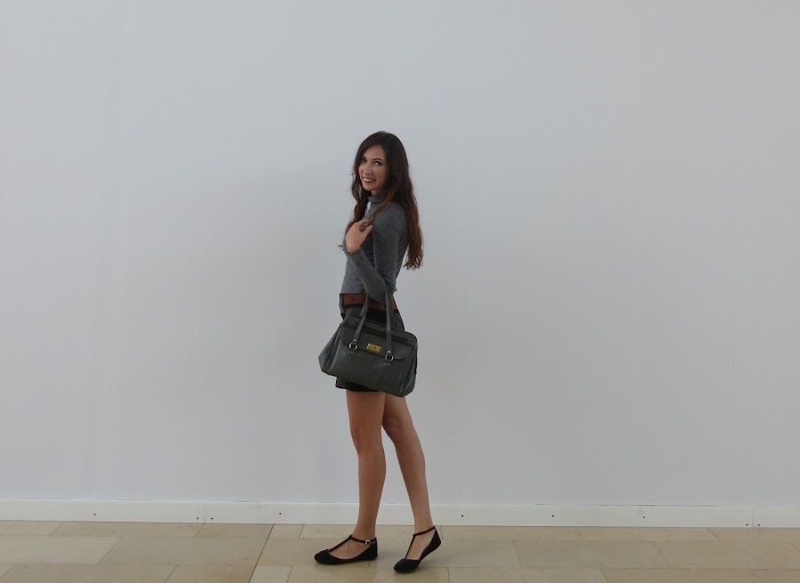 Para terminar mi look necesitaba accesorios y ahí llegó la controversia!; dispongo de unas botas con el tono exacto de mi sweater pero a mi me pareció demasiado conjuntado: jersey gris, bolso gris y botas grises? no me terminaba de convencer, por consecuencia se me ocurrió que añadir mis nuevas bailarinas aterciopeladas le daría un toque muy personal y único, además a mi me encanta!. El trenzado de mi calzado complementa a la unión entre parches de la mini, dando un resultado interesante. No os parece?.