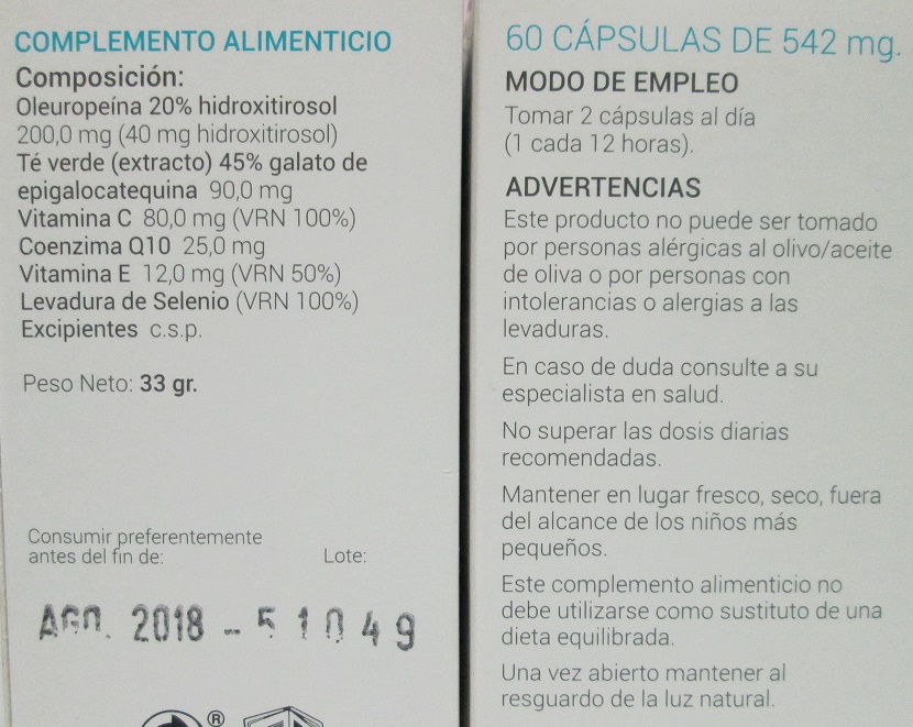 Este complemento es rico a base de antioxidantes, vitaminas y minerales, como: la Vitamina C, Coenzima Q10, Vitamina E, Levadura de Selenio, Oleuropeína, Té Verde, Oligoelementos, entre otros. Unos ingredientes que protegen la estructura de las células del organismo frente a los radicales libres producidos por la alimentación o el ambiente, y con una acción protectora sobre las grasas y membranas celulares.