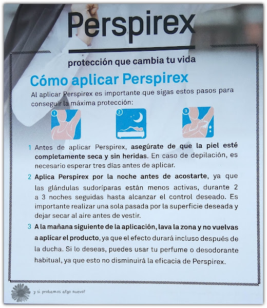 En esta foto se explica muy bien cómo hay que usar Perspirex. Las primeras veces hay que echarse 3 días seguidos, mejor por la noche y con las axilas limpias. Al día siguiente se recomienda limpiar la zona y no volver a aplicar el producto hasta la noche. Después de estos 3 días es recomendable usar Perspirex un par de veces por semana y no hace falta ningún otro desodorante.