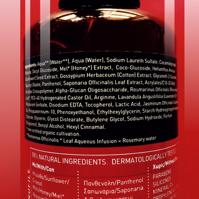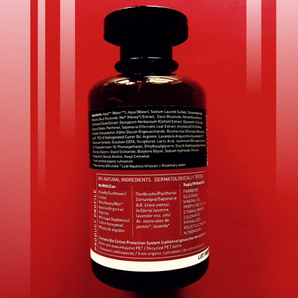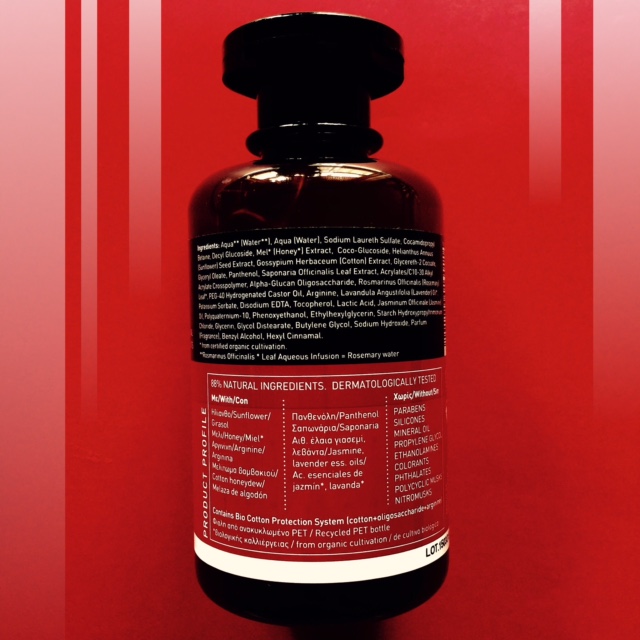 Girasol (incentiva el brillo en el cabello y suavidad), Miel (restaura la suavidad y brillo), Arginina (fortalece y disminuye la caída del cabello), Melaza de algodón (ayuda al crecimiento y mejora la textura), Saponaria (limpia el exceso de grasa en el cuero cabelludo), Aceite esencial de jazmín y de lavanda (con gran acción hidratante y reestructurante) y un sistema de protecciones de algodón biológico (algodón+oligosacáridos+arginina exclusivo de la marca, que refuerza la estructura del cabello, formando una capa protectora contra agentes externos) e infusión de romero en vez de agua, previniendo la caída y ayudando a mantener el cabello sano.
