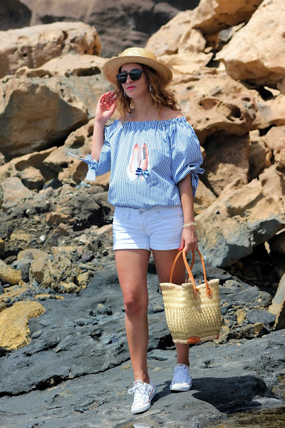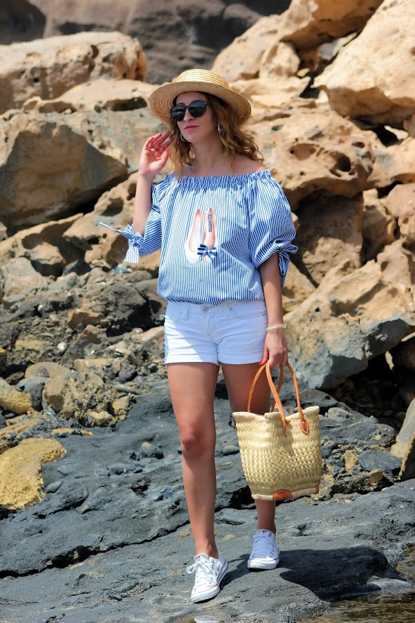 Estas imágenes son de la isla de Fuerteventura, durante mis vacaciones de verano. La combiné sencillamente para ir de paseo y almorzar en la costa. Unos shorts blancos, converse y mi bolso procedente de Madagascar, de fibras naturales, hecho a mano y de comercio justo.