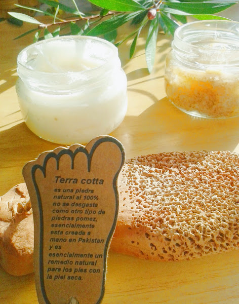 Then rub with terracotta pumice stone, you can find it in health food and natural food stores. You can also use a regular pumice stone. What I like about this terracota stone is how soft it is, and also that it doesn´t harm the skin, removes dead skin and softens hard skin as well.