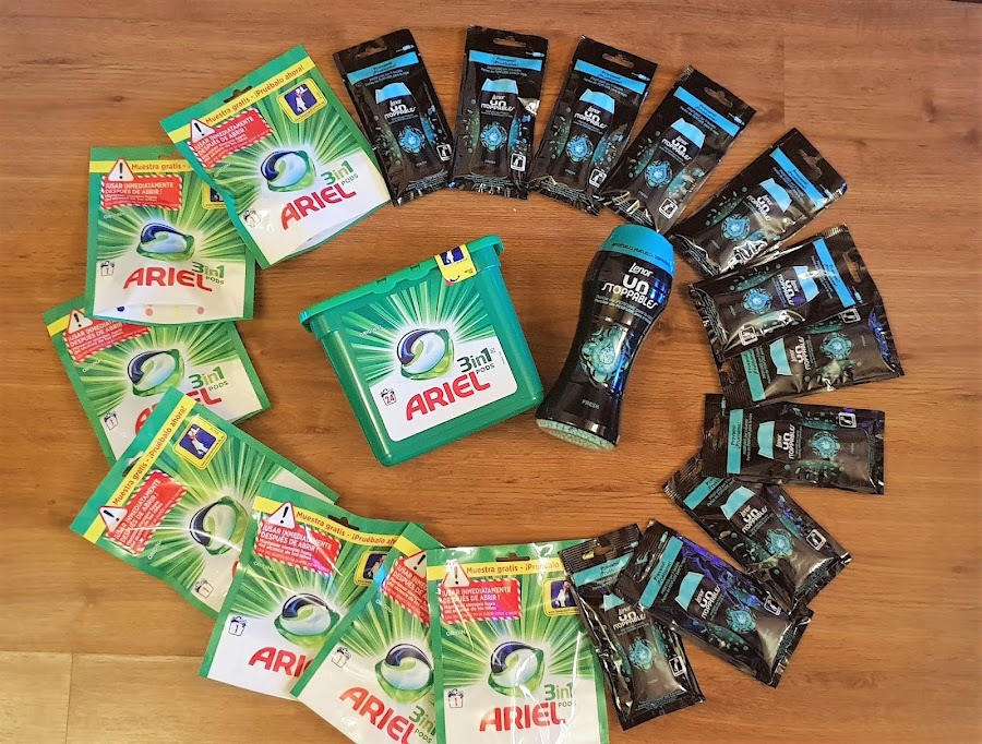 Para las que no, os cuento un poco por encima, hace más o menos un mes, recibí gracias a la comunidad de probadoras de Próxima a ti, un lote de Ariel y Lenor, con productos tamaño venta y bastantes muestras para probar y dar a conocer ambos productos. Este fue el lote que recibí en mi casa: