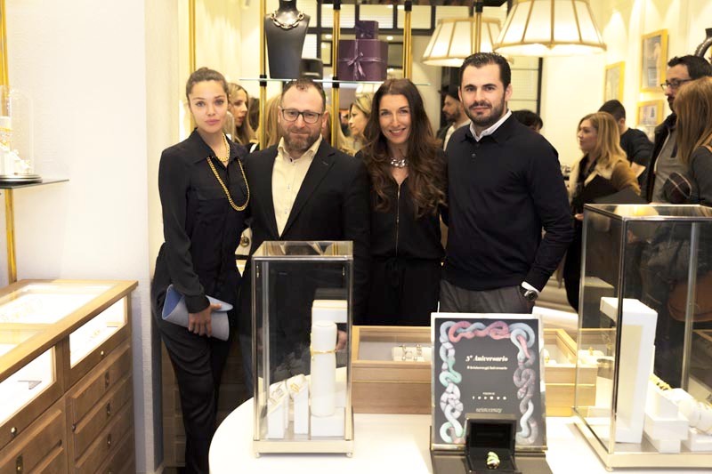 Samantha Vallejo-Nájera: una serpiente inspirada en sus lemas vitales: felicidad y alegría. Confeccionada con zafiros rosas, naranjas y rubíes engastados en Plata de Ley recubierta de Oro rosa de 18kts.