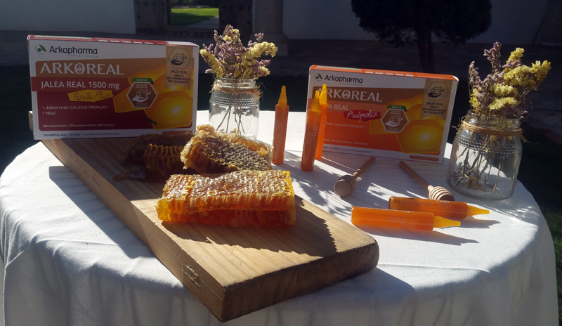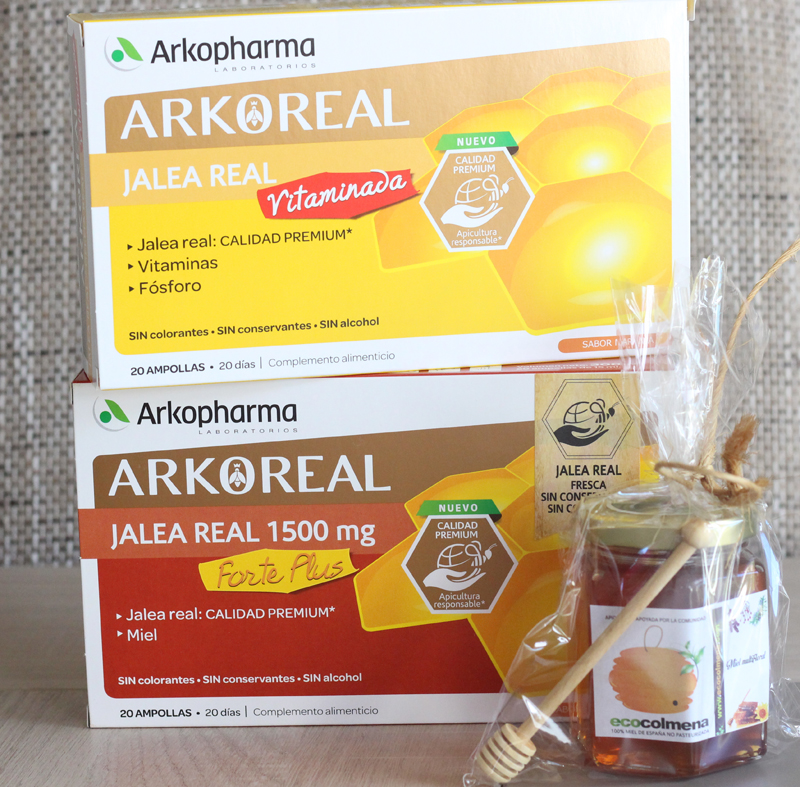 Y también nos llevamos una bolsita de Arkopharma con dos de las variedades de la línea Arkoreal: Jalea Real Vitaminada y Jalea Real Forte Plus. Y un bote de miel de Eco Colmena.