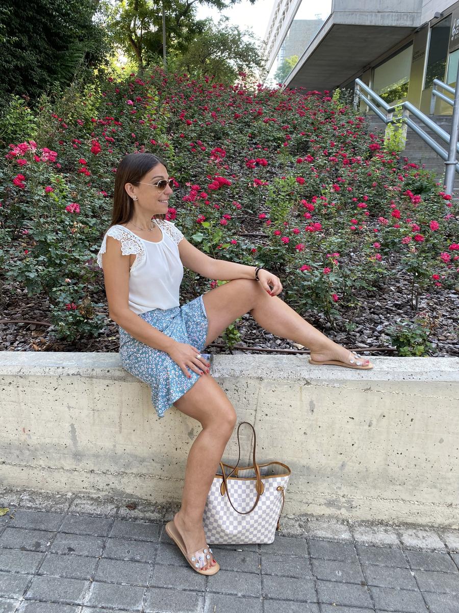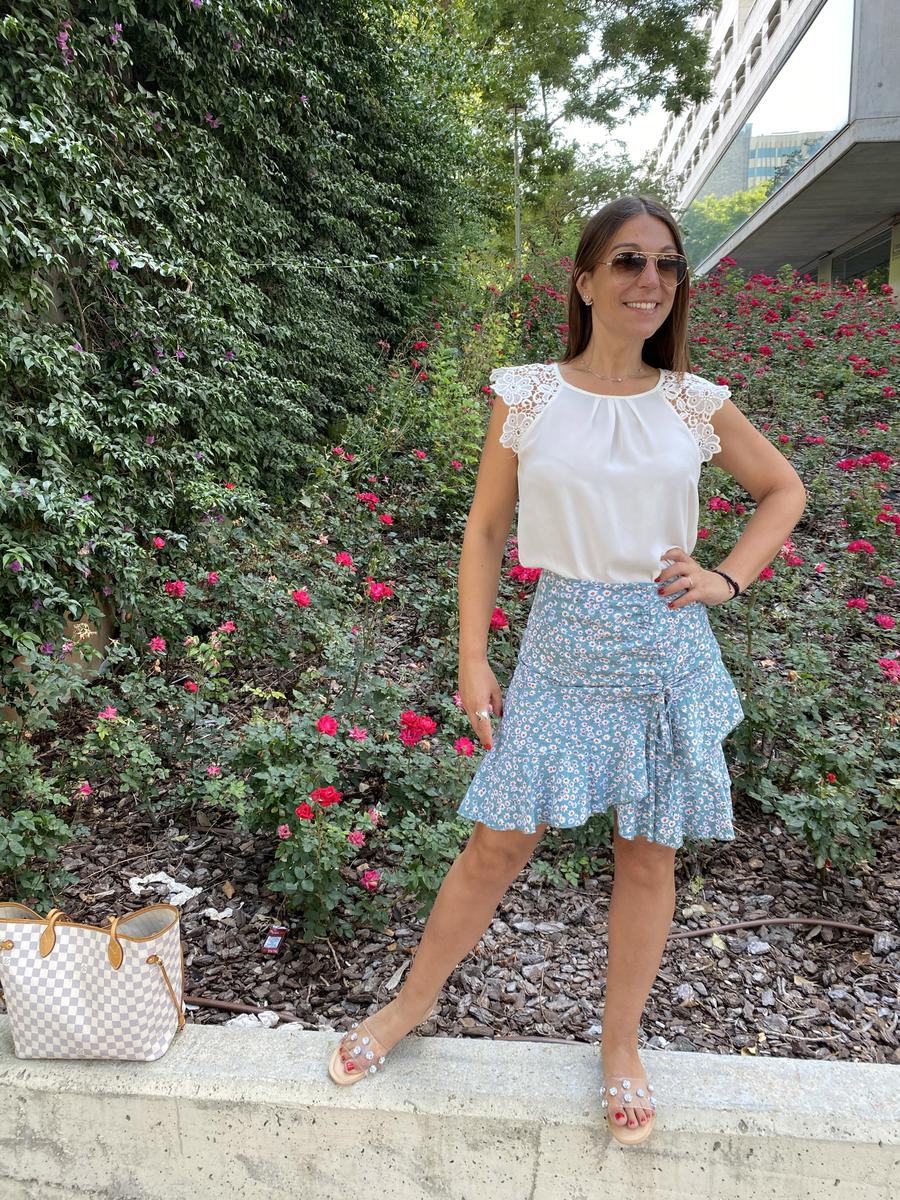 En el look de hoy llevo una falda en color verde salpicada con pequeñas flores, con volantes cruzados y lo original de esta prenda es que tu decides la asimetría, más acentuada o menos, ya que lleva dos cordones para fruncir la falda de lado. Combinado con una blusa con encaje en los hombros y mis zapatos preferidos de este verano, unas palas de vinilo adornadas con brillantes.
