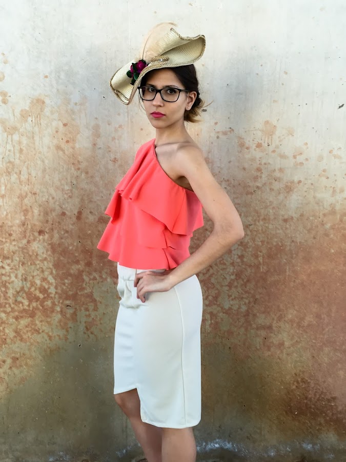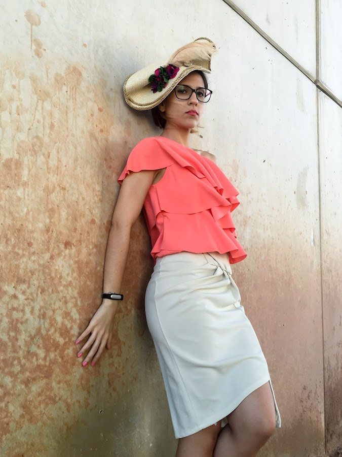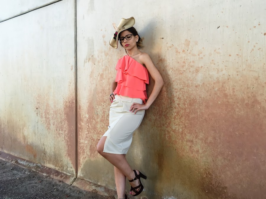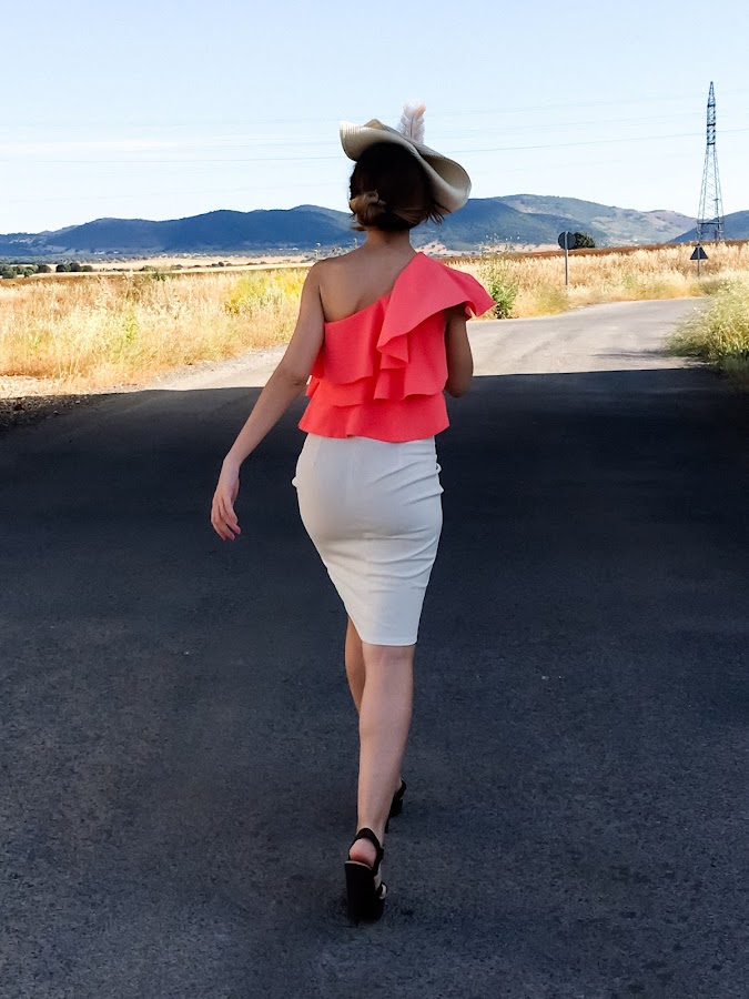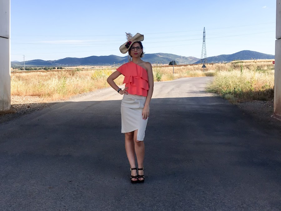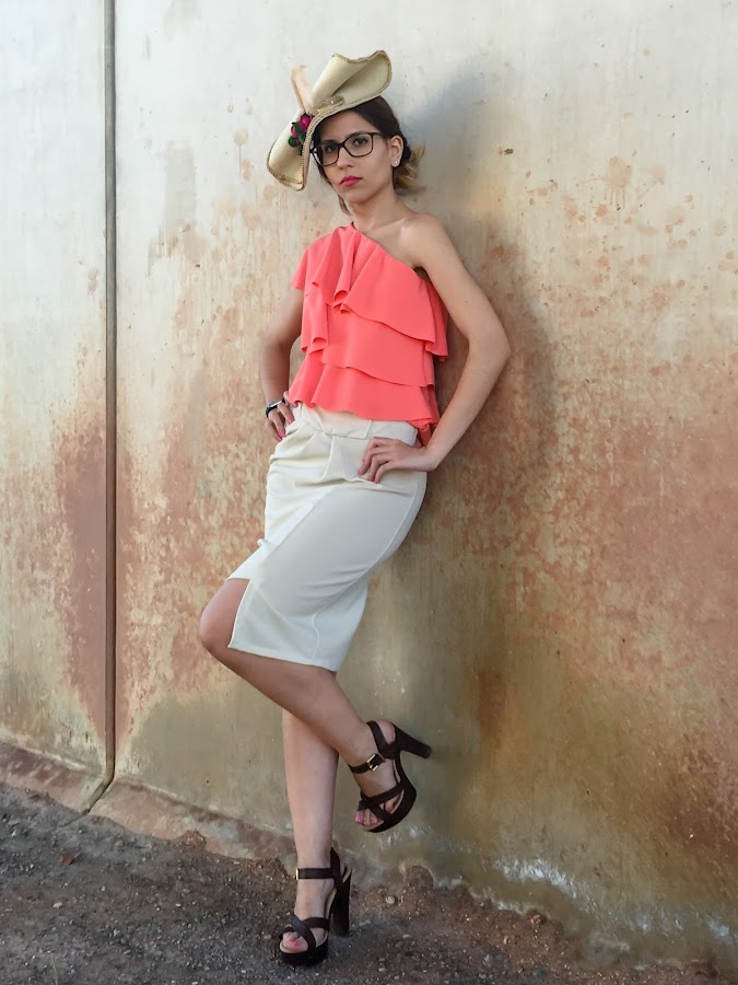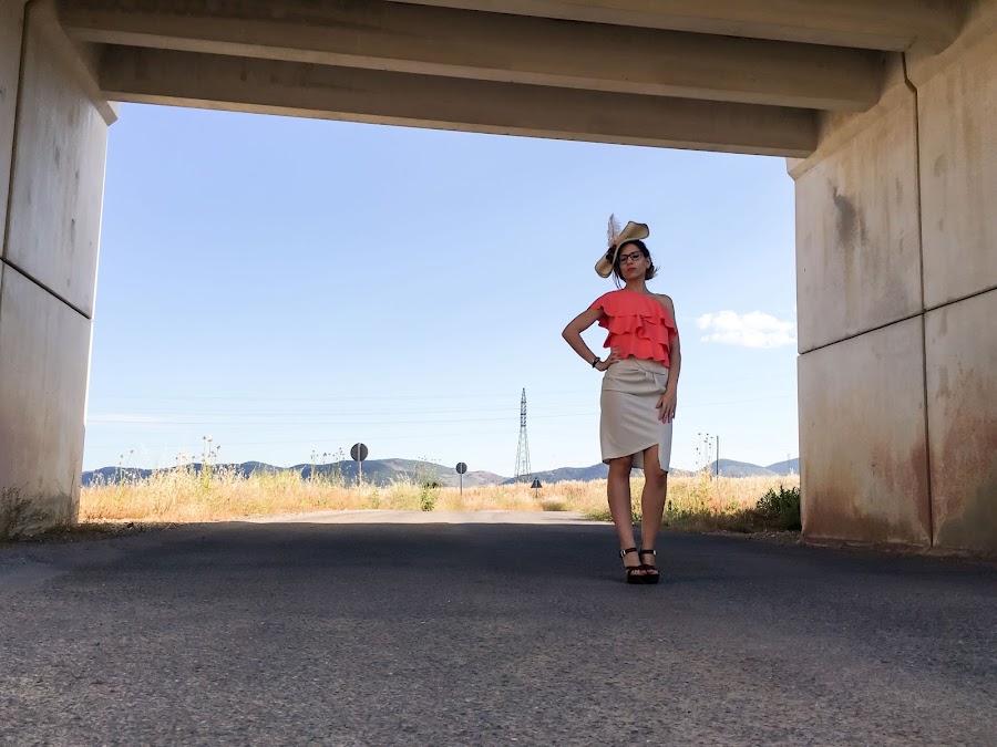El verano es tiempo de fiestas y eventos tanto familiares como de amigos, y el de hoy es un look perfecto para algún evento de día. He elegido un top asimétrico de volantes en un color muy vivo y una falda asimétrica beige con pinzas en el delantero y un corte muy original.