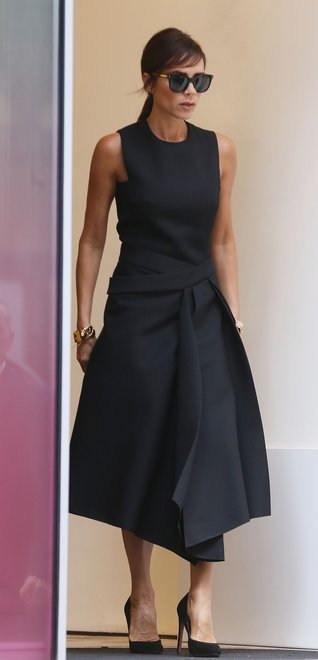 Victoria Beckham,quien nadie discute que tiene buen gusto para la moda.Esta vez utiliza una version nueva de un traje clasico de la interprete de Breakfast at Tiffany.