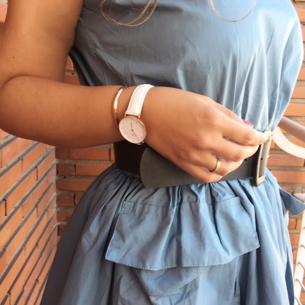 Como os decía, yo he compuesto un outfit de día y de entretiempo, así que lo he combinado con sandalias plateadas de Uterque y complementos en tonos blancos, como mi reloj de Daniel Wellington, pero si queréis darle un toque más otoñal sólo tenéis que incorporar unas medias tupidas negras y una perfecto de piel del mismo tono e iréis ideales.