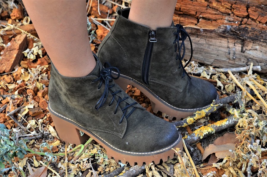 Primero de todo, los botines verde oliva. Son de Rosegal, y la verdad que son una maravilla. El tacón que tiene es tan cómodo que es como ir en planos y la cremallera lateral es genial porque evita el tener que atar cordones, sobre todo esos días que vamos apuradas y nos calzamos a la carrera. Son de entretiempo pero con unos calcetines también son ideales para el invierno.