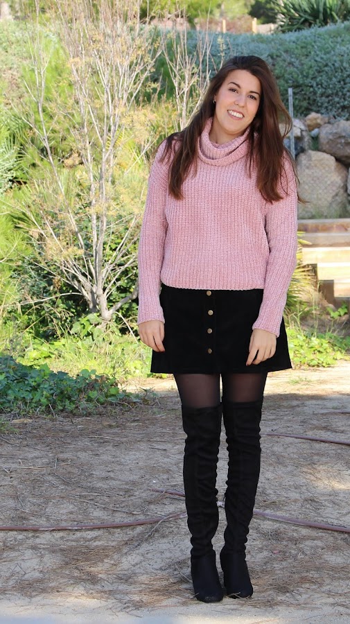 El tercer outfit este compuesto por la falda en forma de A de ante de Stradivarius, el jersey de punto de Bershka y las botas por encima de la rodilla de Primark.