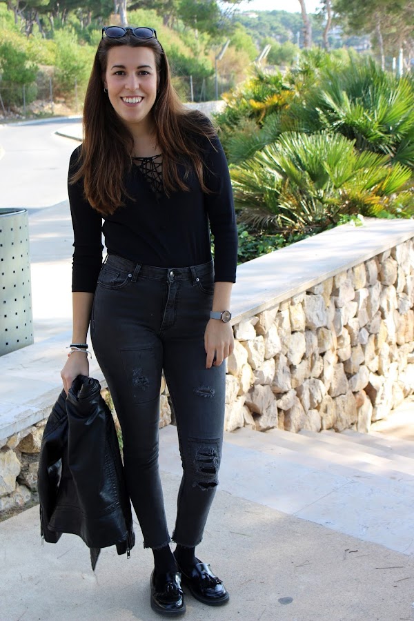 En este look repito el body, la cazadora de H&M y el pantalón roto es de la mid season sale de H&M y los mocasines de Stradivarius. Vamos un total look de H&M.
