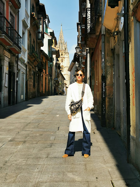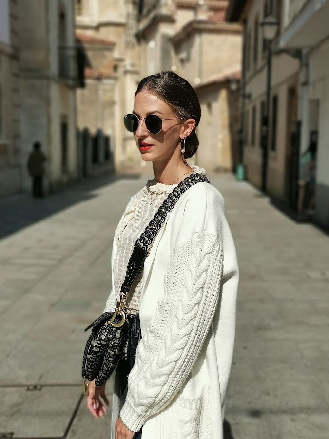 Este estilo de pantalón no pensé que lo volvería a usar, si, soy de las que dijo "yo jamás me volveré a poner pata elefante" y ¡aquí estoy!. Como complementos unos botines estilo cowboy, el bolso Saddle de Dior que se ha convertido en la joya de mi armario y los aros que son de Majorica, y me parecen preciosos