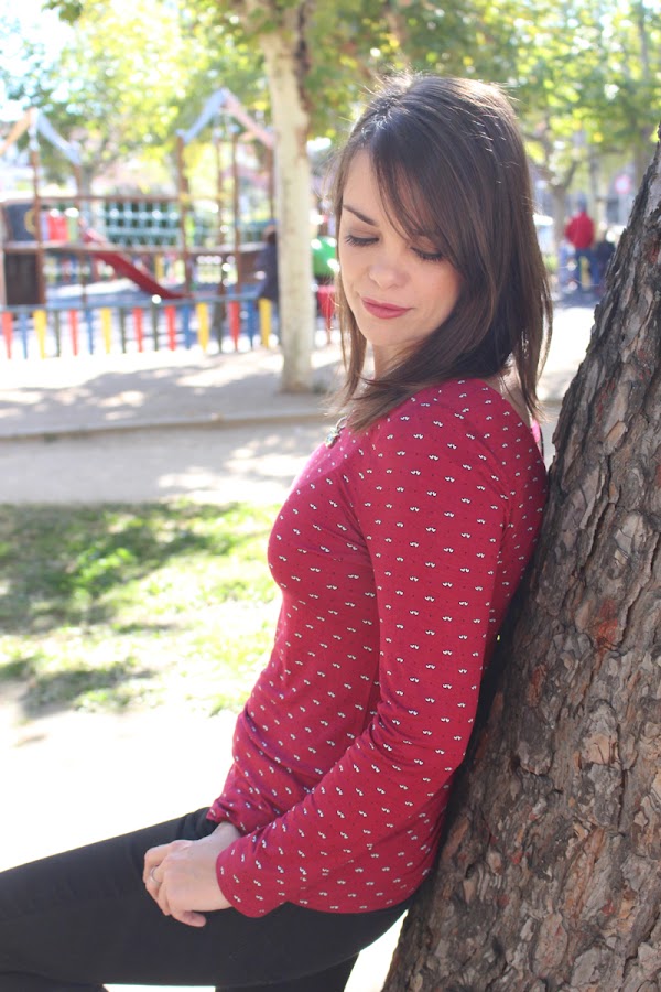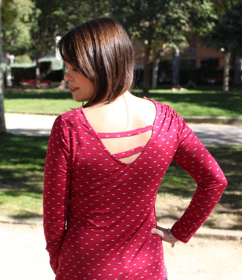 La camiseta es de tejido muy finito, bastante ajustada, de color frambuesa con estampado de puntitos negros y parejitas de corazones blancos, y detalle de escote en la espalda, que le da un toque muy especial a la camiseta. Estoy segura que la voy a dar mucho uso y me costó 5 euros y pico nada más, ¡está genial!