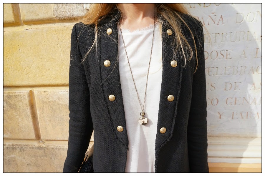 La chaqueta militar es Stradivarius de hace dos años. Podéis encontrar una de aire similar en la actual colección aquí. Normalmente las chaquetas de Stradivarius no cubren completamente mis largos brazos, pero en este caso "sonó la flauta" y no lo dudé!